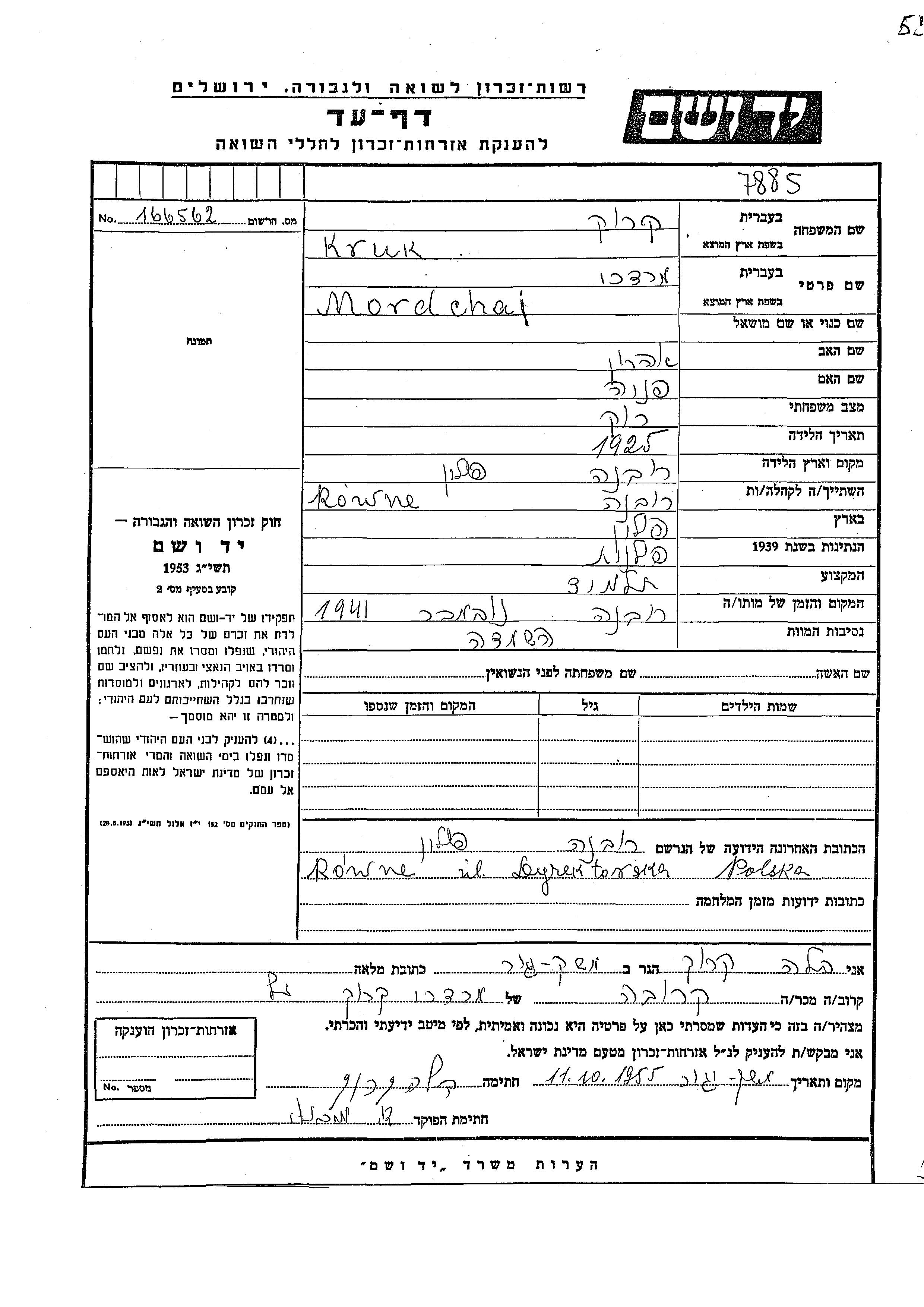 Kruk Mordchaj 1925 Rowne, Pologne Feuille de témoignage