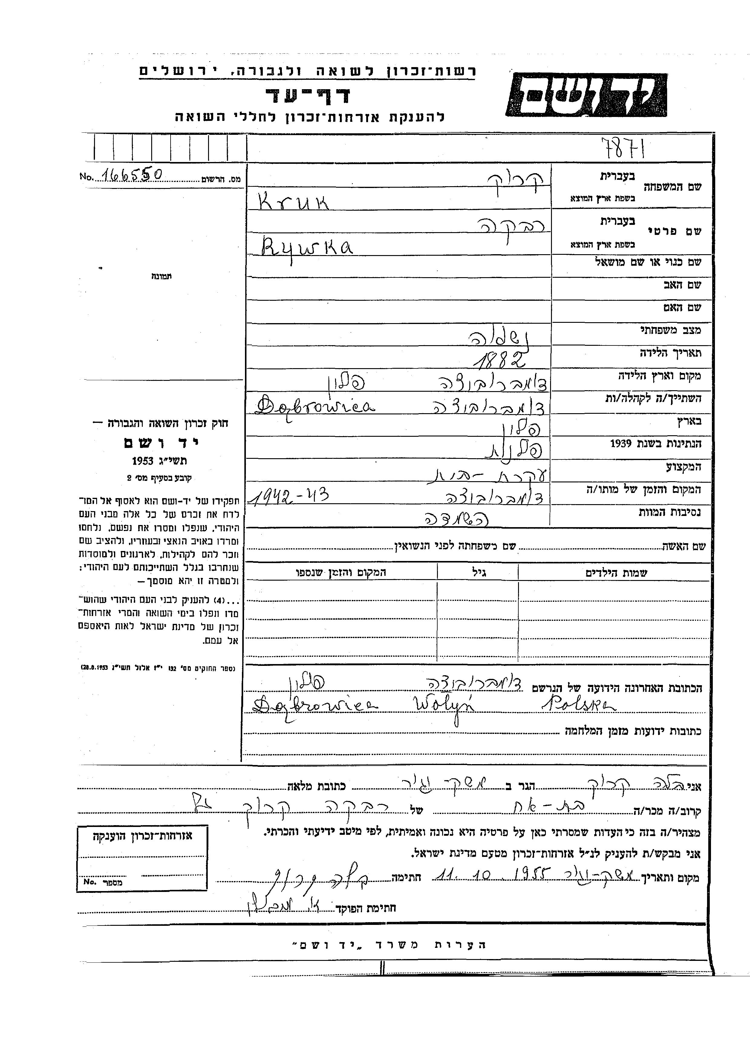 Kruk Rywka 1882 Dombrowice, Pologne Feuille de témoignage