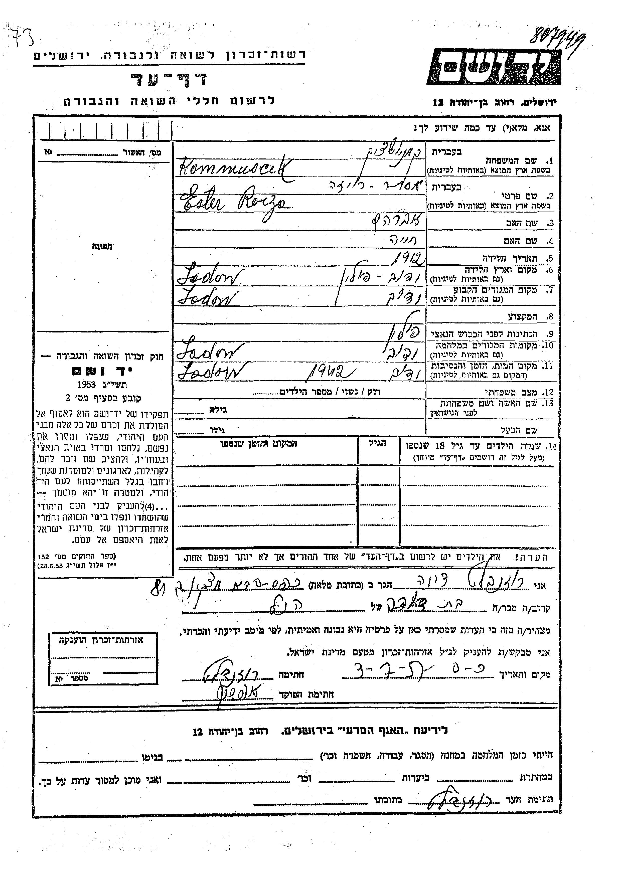 Komniuscik Rosza Ester Roiza 1912 Jadow, Pologne Feuille de témoignage