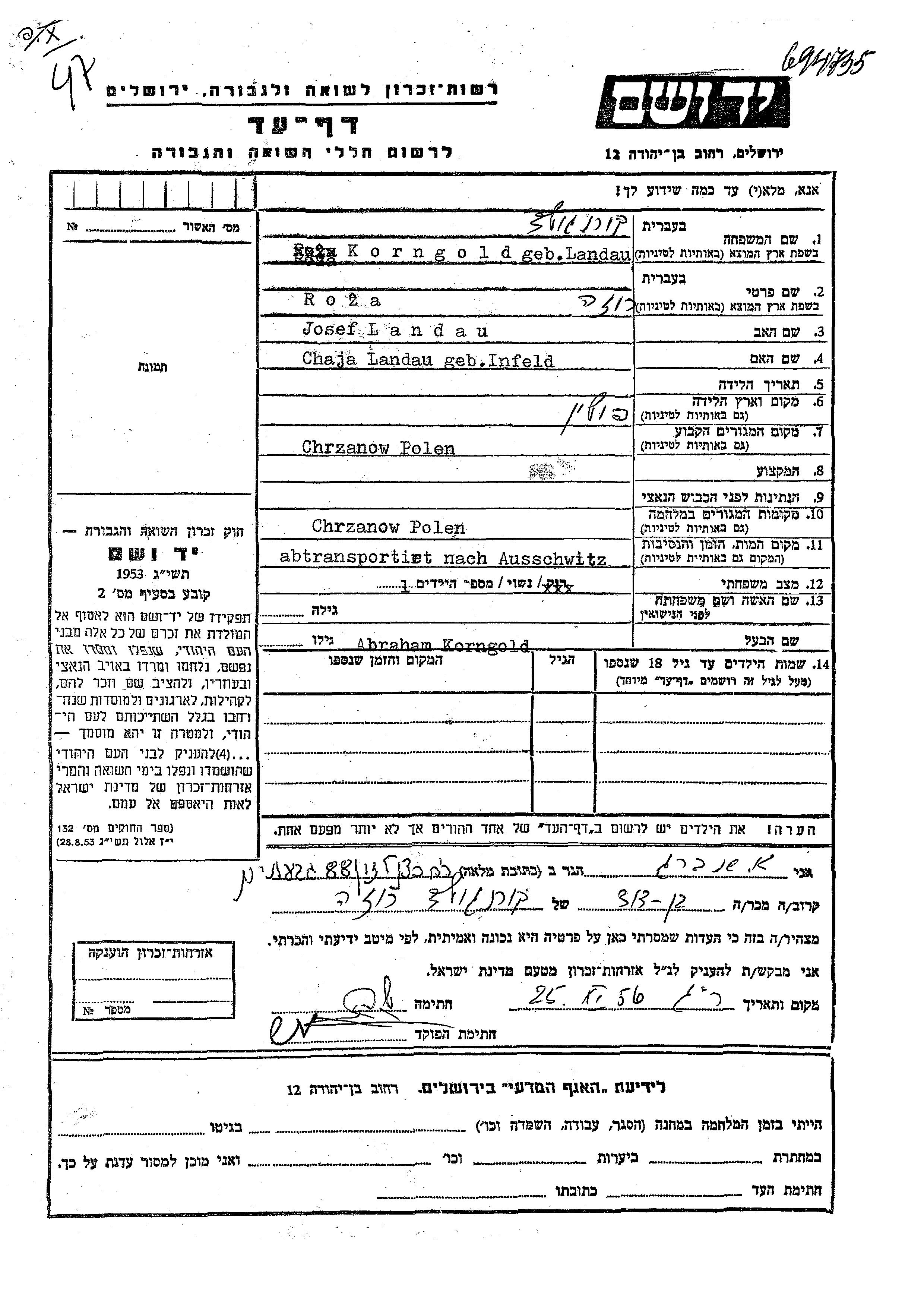 Korngold Roza Chrzanow, Pologne Feuille de témoignage