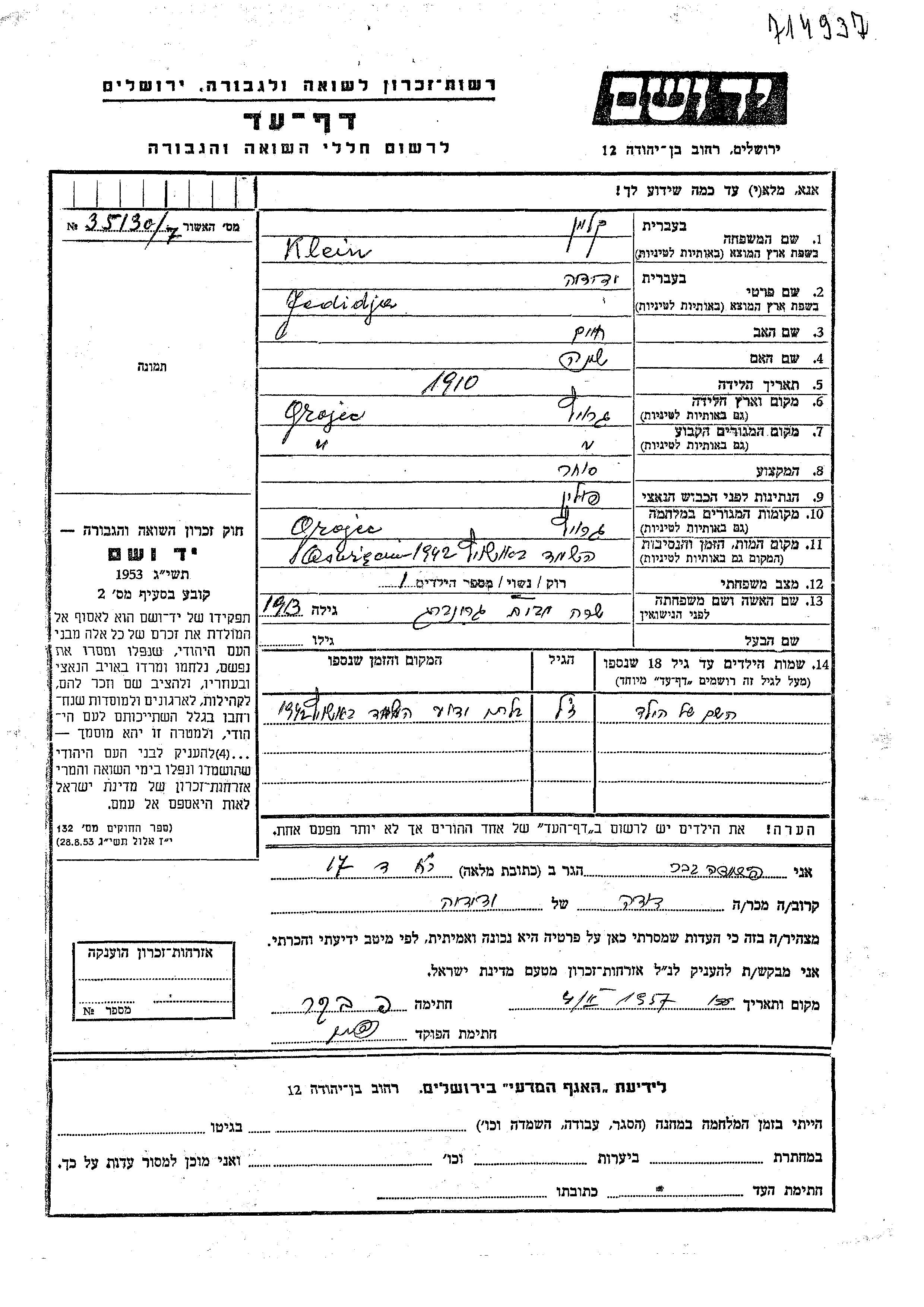Klein Yedidia 1910 Grojec, Pologne Feuille de témoignage