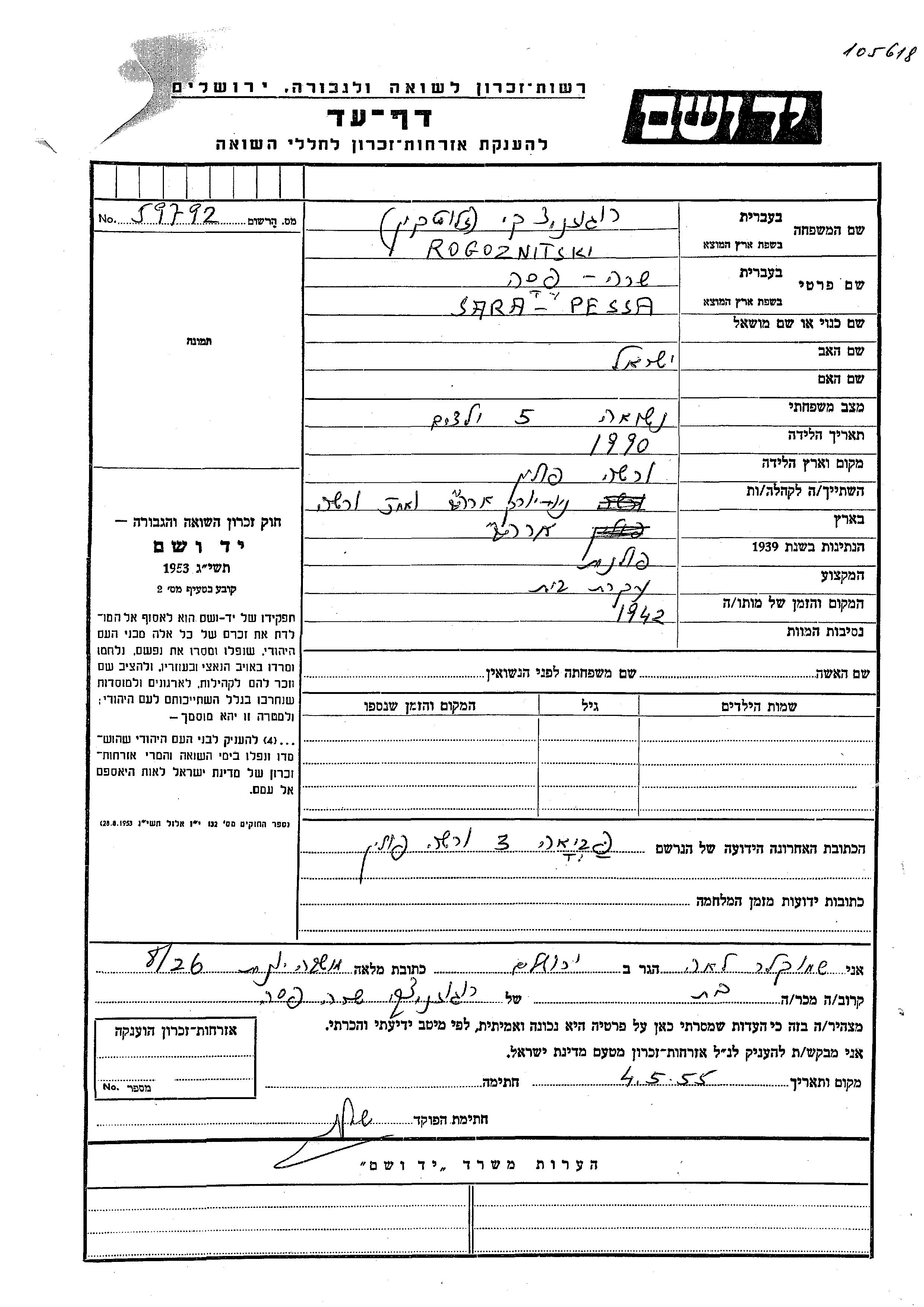 Pessa Sara Pesa Rogoznitski est née à Warsaw, Pologne en 1890, fille de Yisrael. Elle était Femme au foyer. Pendant la guerre, elle était à Warsaw, Pologne.