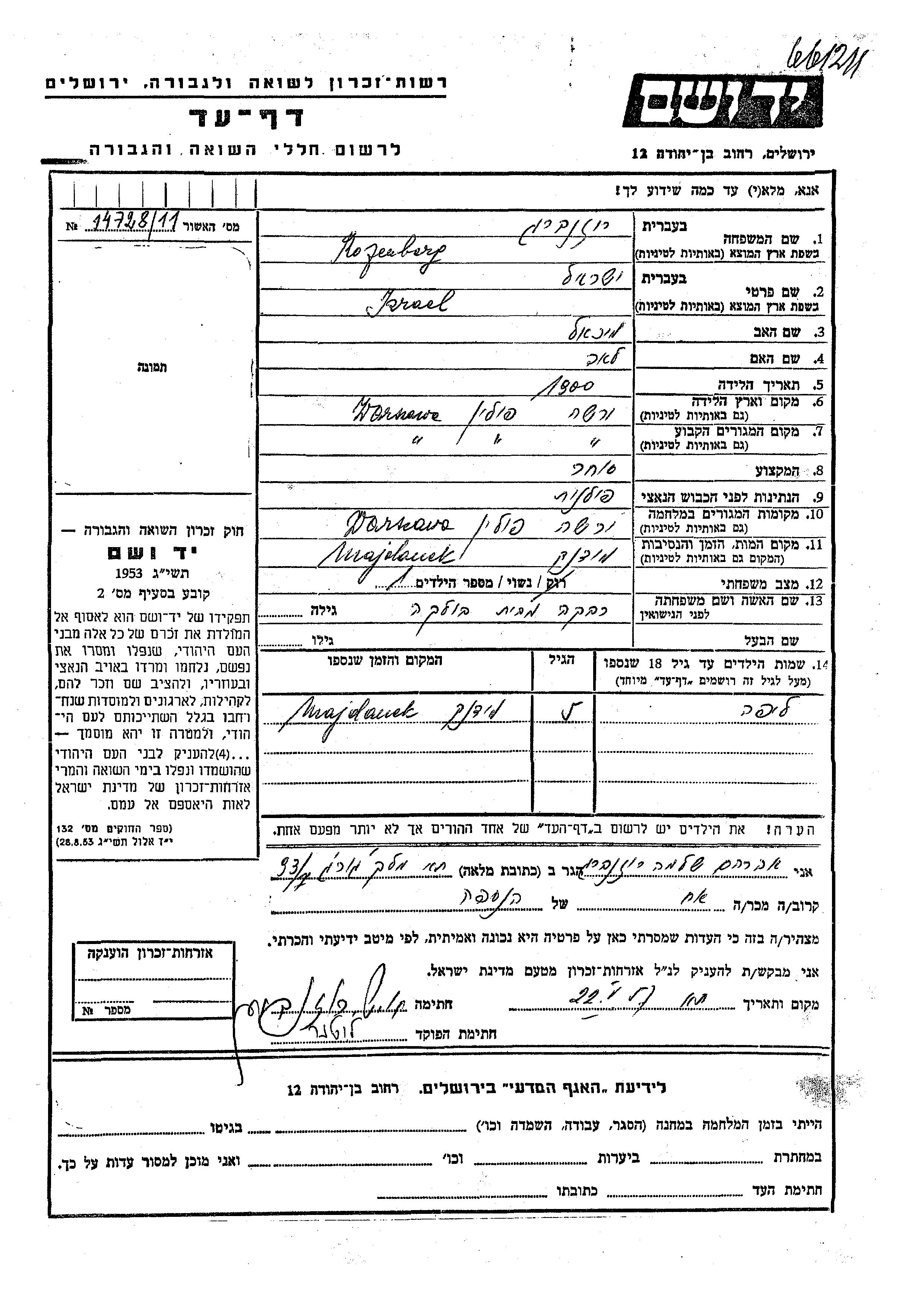 Israel Rozenberg est né à Varsha, Pologne en 1900, fils de Mikhael et de Lea. Il était Commerçant/e et Mariée à Rivka née Bulka. Avant la seconde guerre mondiale il vivait à Varsha, Pologne. Au cours de la guerre, il était à Varsha, Pologne.