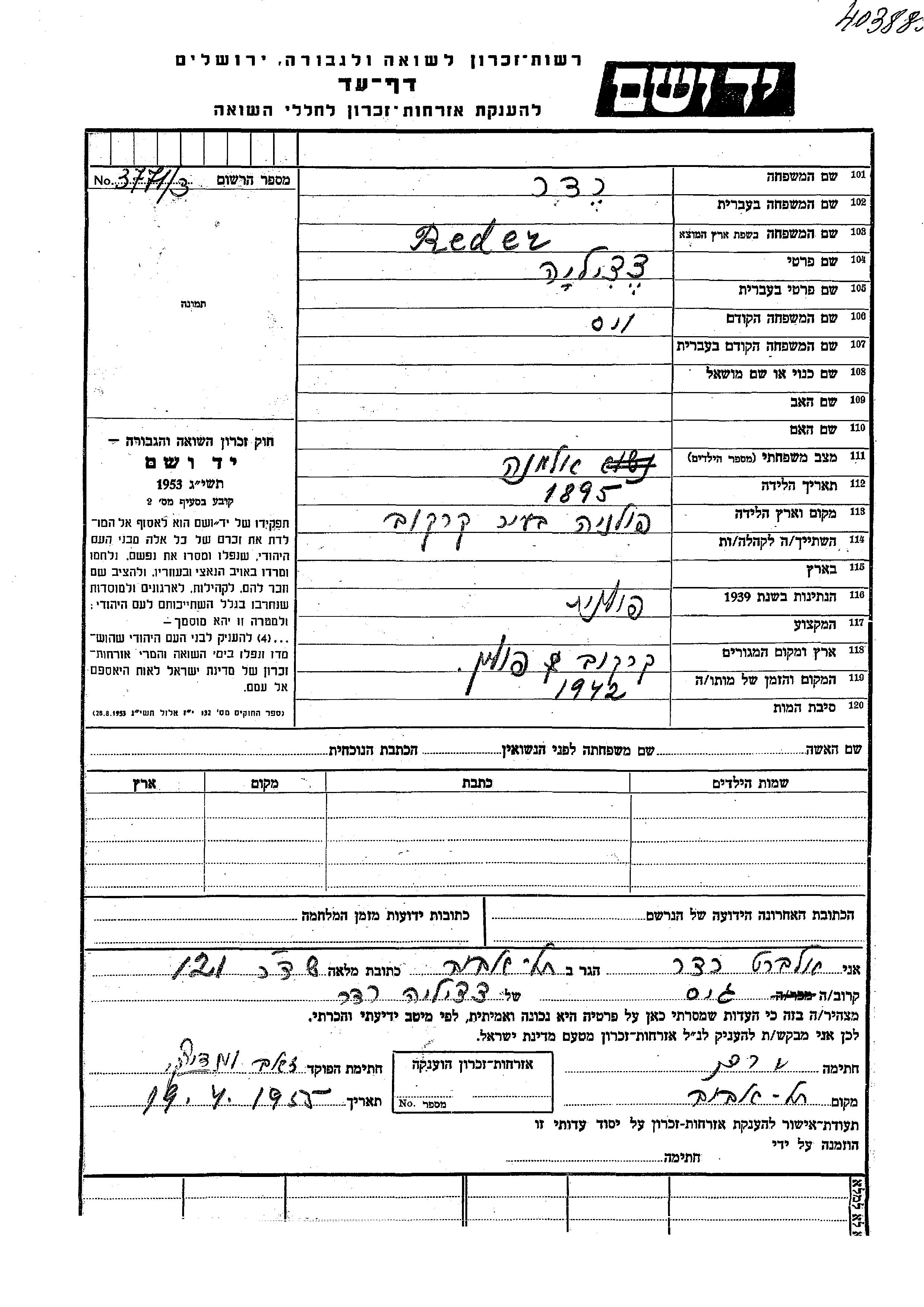 Reder Rader Tzetzilia 1895 endroit inconnu, Feuille de témoignage