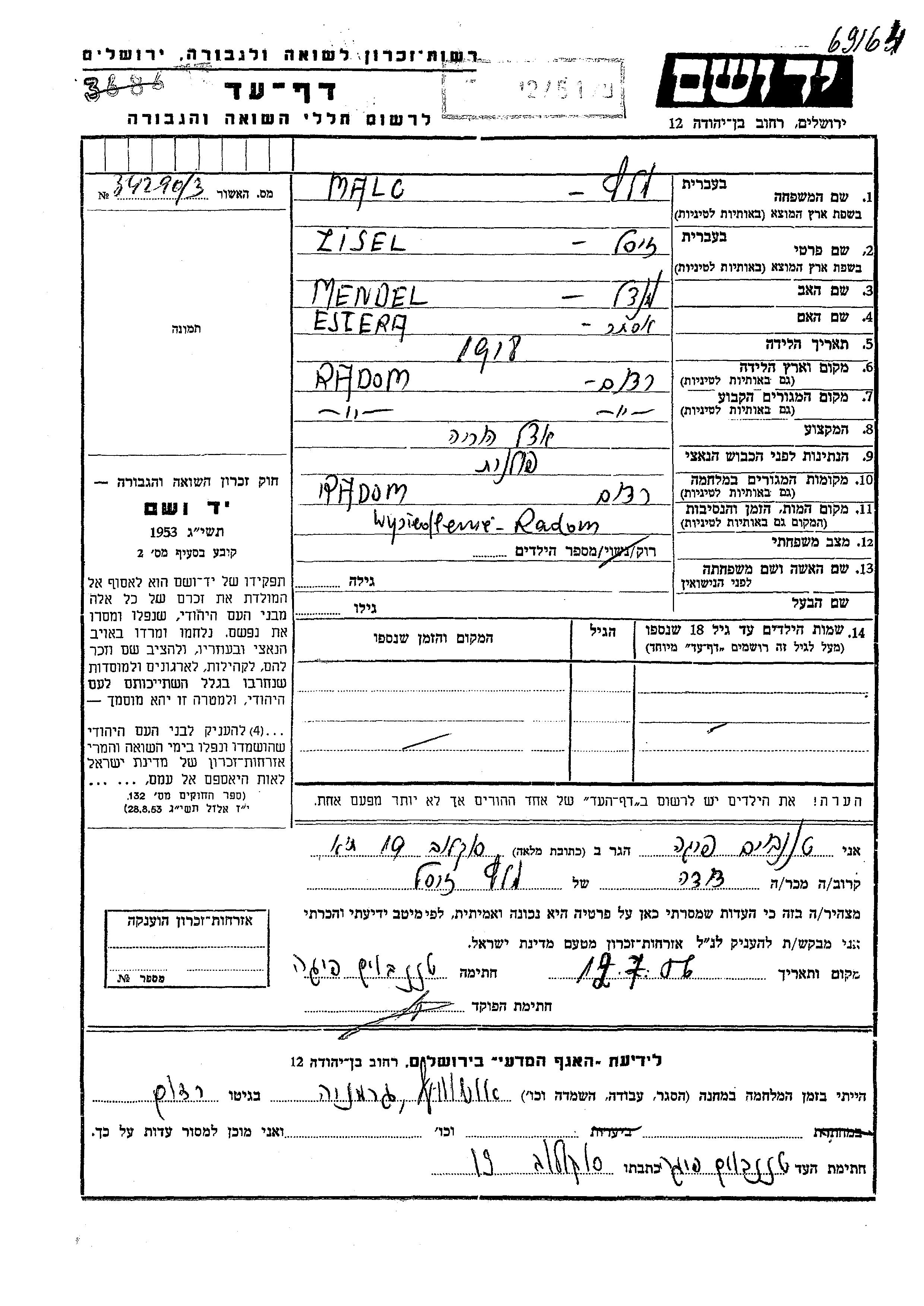 Malc Zisel Zysl 1918 Radom, Pologne Feuille de témoignage