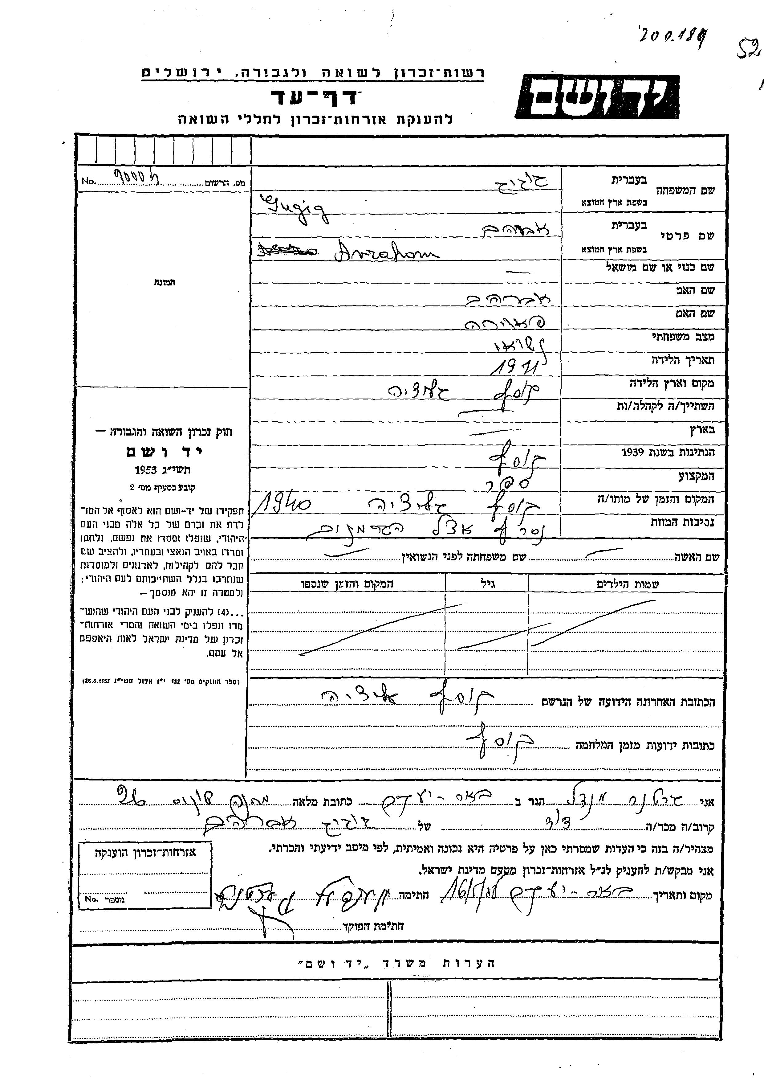 Gugig Abraham 1911 Kosow, Pologne Feuille de témoignage