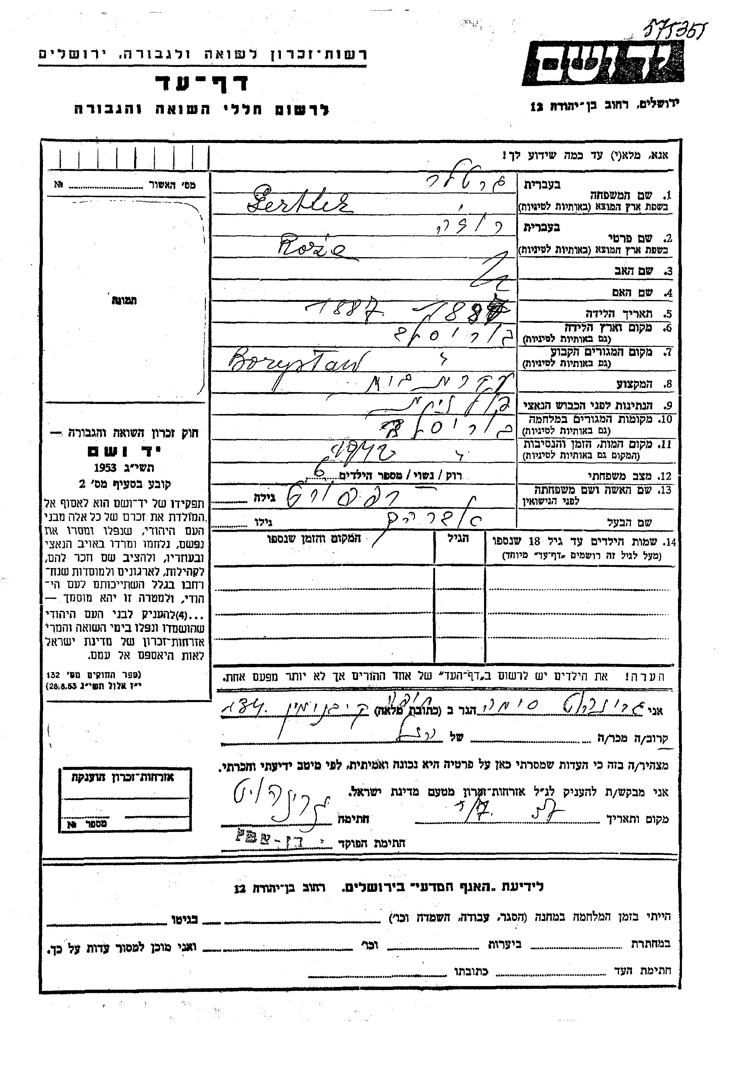 Gertler Roza 1887 Boryslaw, Pologne Feuille de témoignage