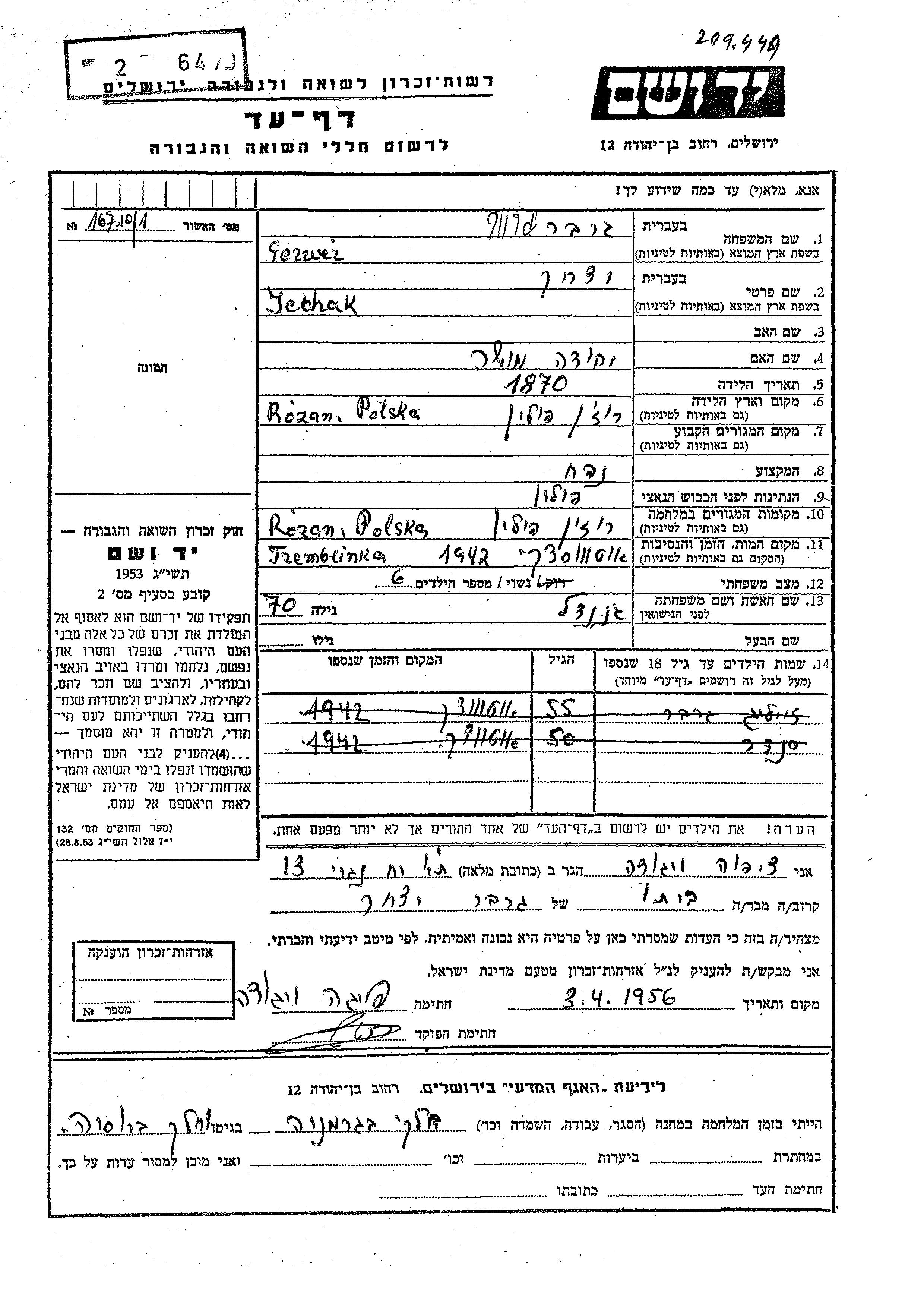 Ycchak a été assassiné pendant la Shoah. Lieu de la mort: Treblinka, Pologne en 1942.