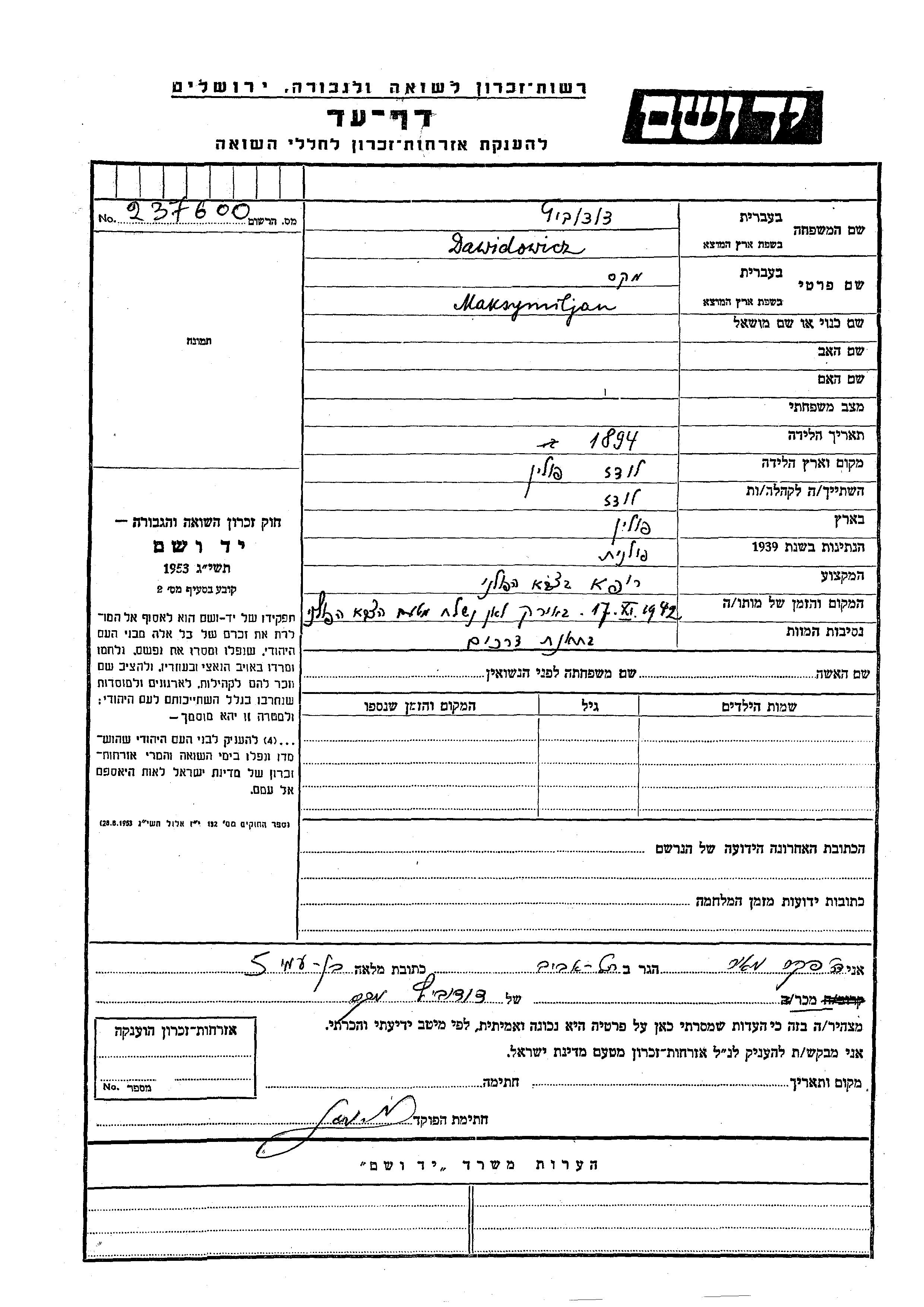 Dawidowicz Maksymiljan 1894 Lodz, Pologne Feuille de témoignage