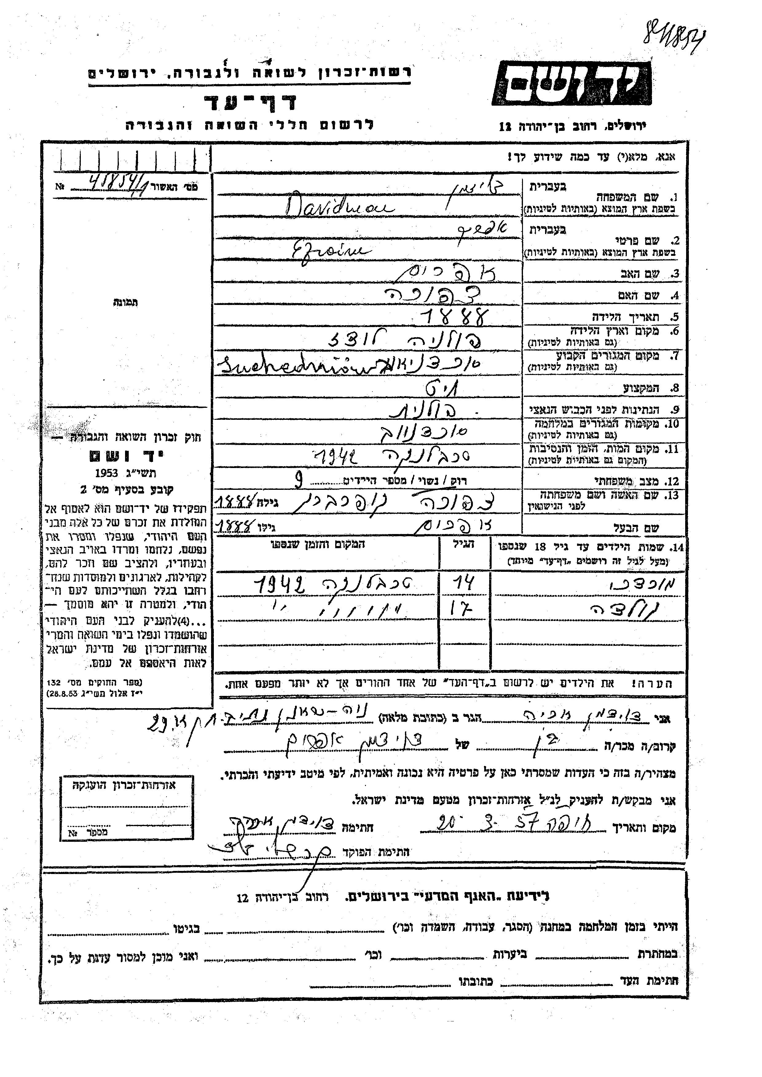 Davidman Efraim 1888 Suchedniow, Pologne Feuille de témoignage