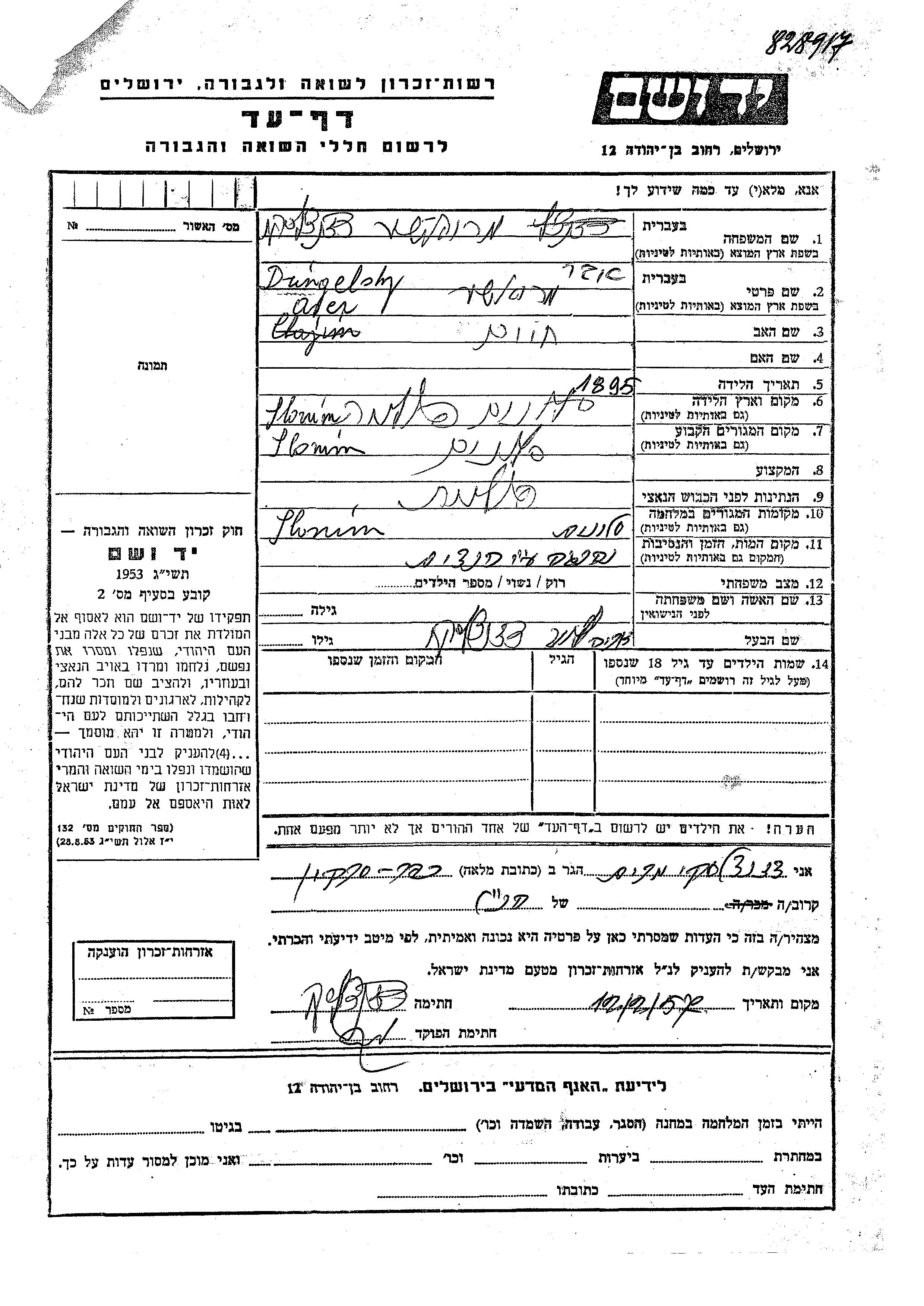 Dzingelsky Mariashe 1895 Slonim, Pologne Feuille de témoignage