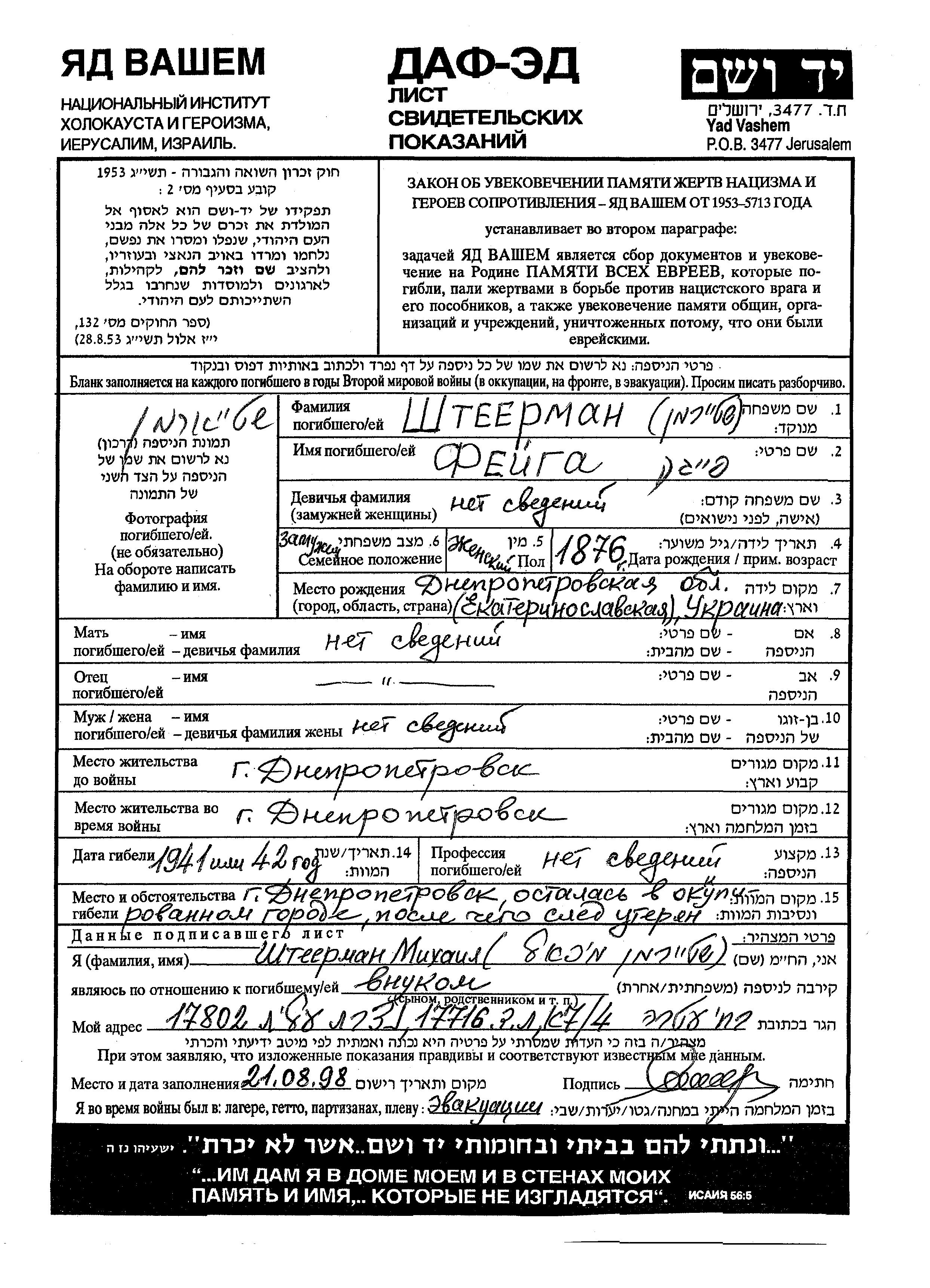 Shteierman Shterman Feiga 1876 Dnepropetrovsk, Ukraine (URSS) Feuille de témoignage