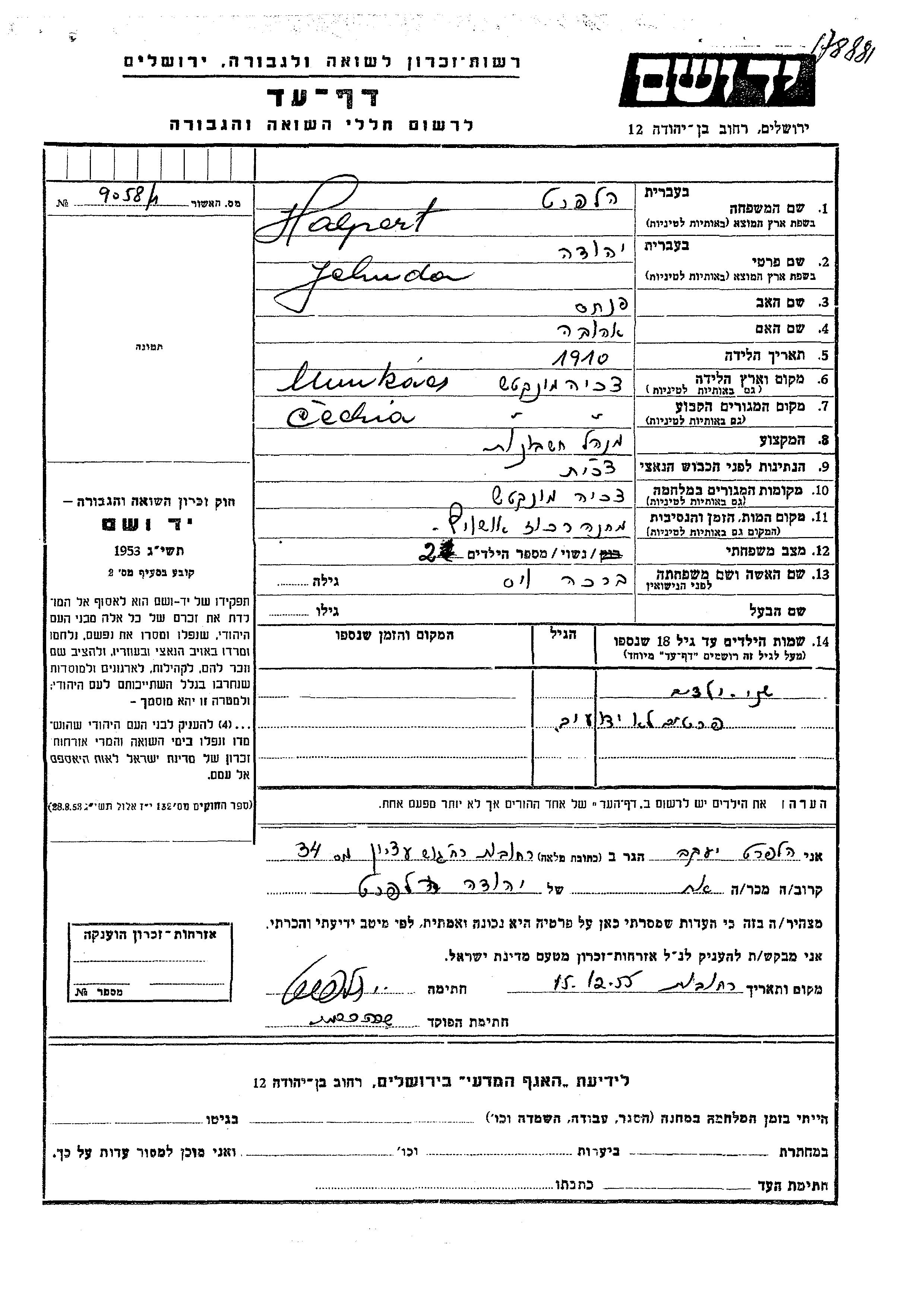 Halpert Yahuda 1910 Munkacs, Tchécoslovaquie Feuille de témoignage