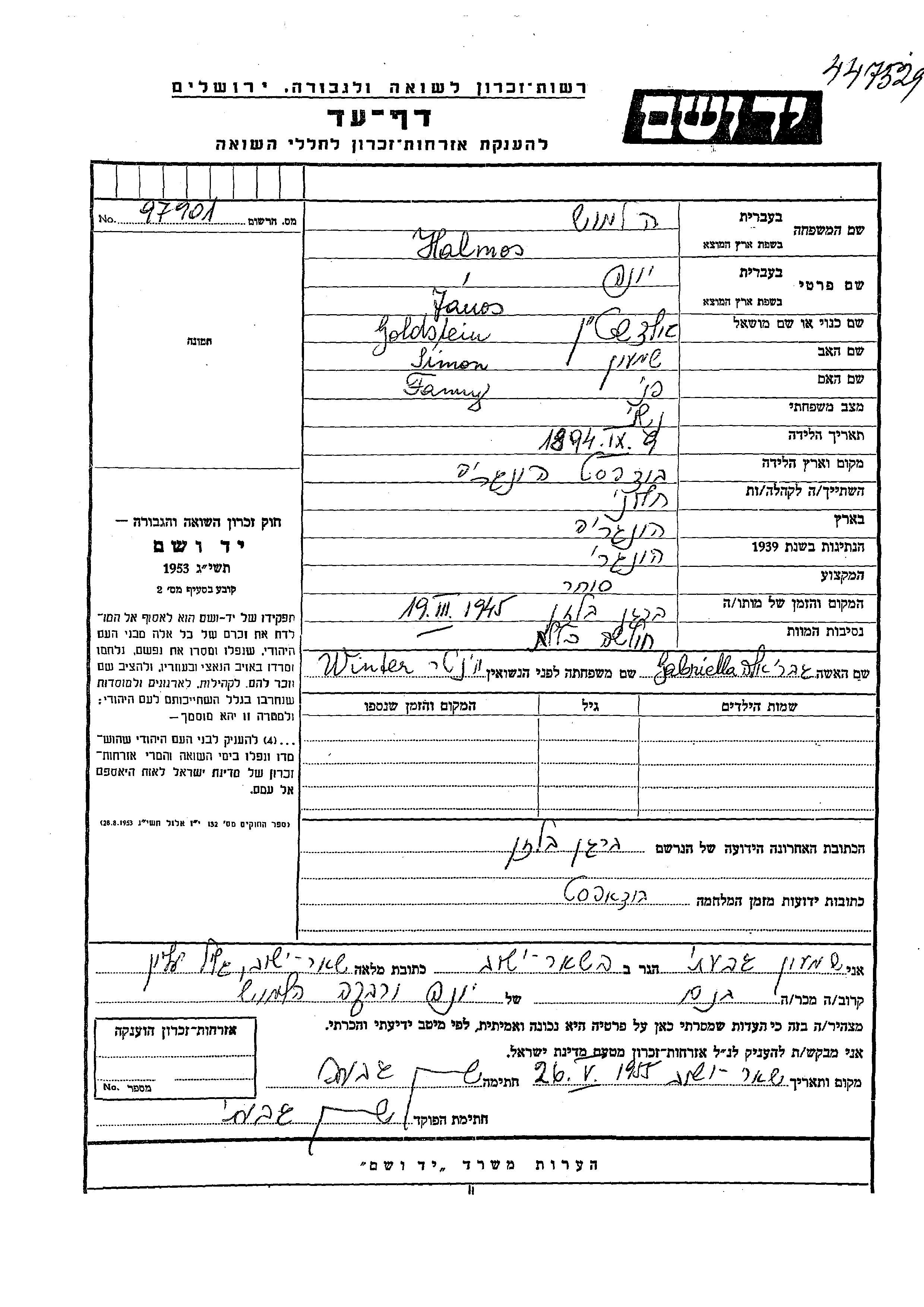 Yad Vashem - Pages of Testimony Names Memorial Collection