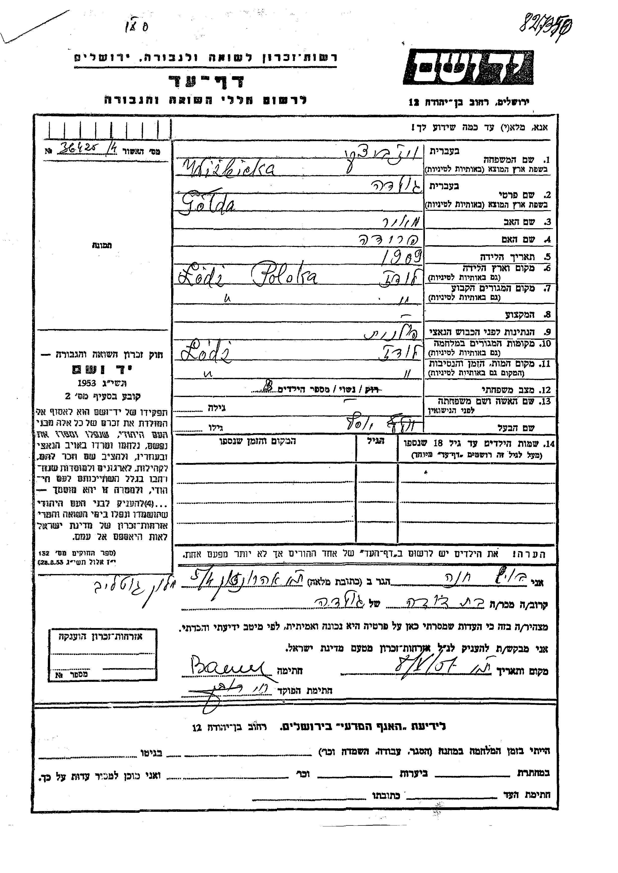 Wizbicka Golda 1909 Lodz, Pologne Feuille de témoignage