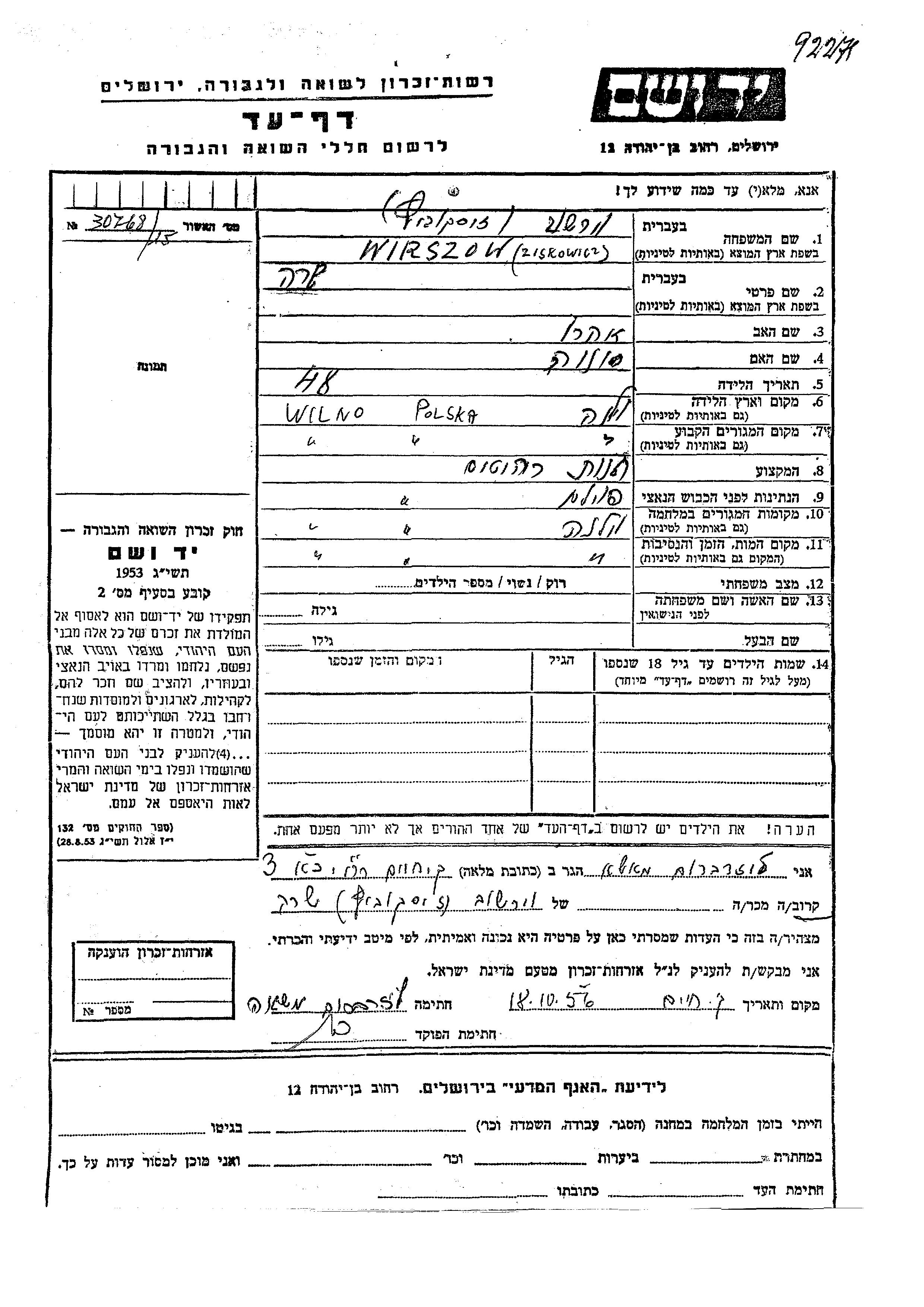 Wirszow Sara Wilno, Pologne Feuille de témoignage