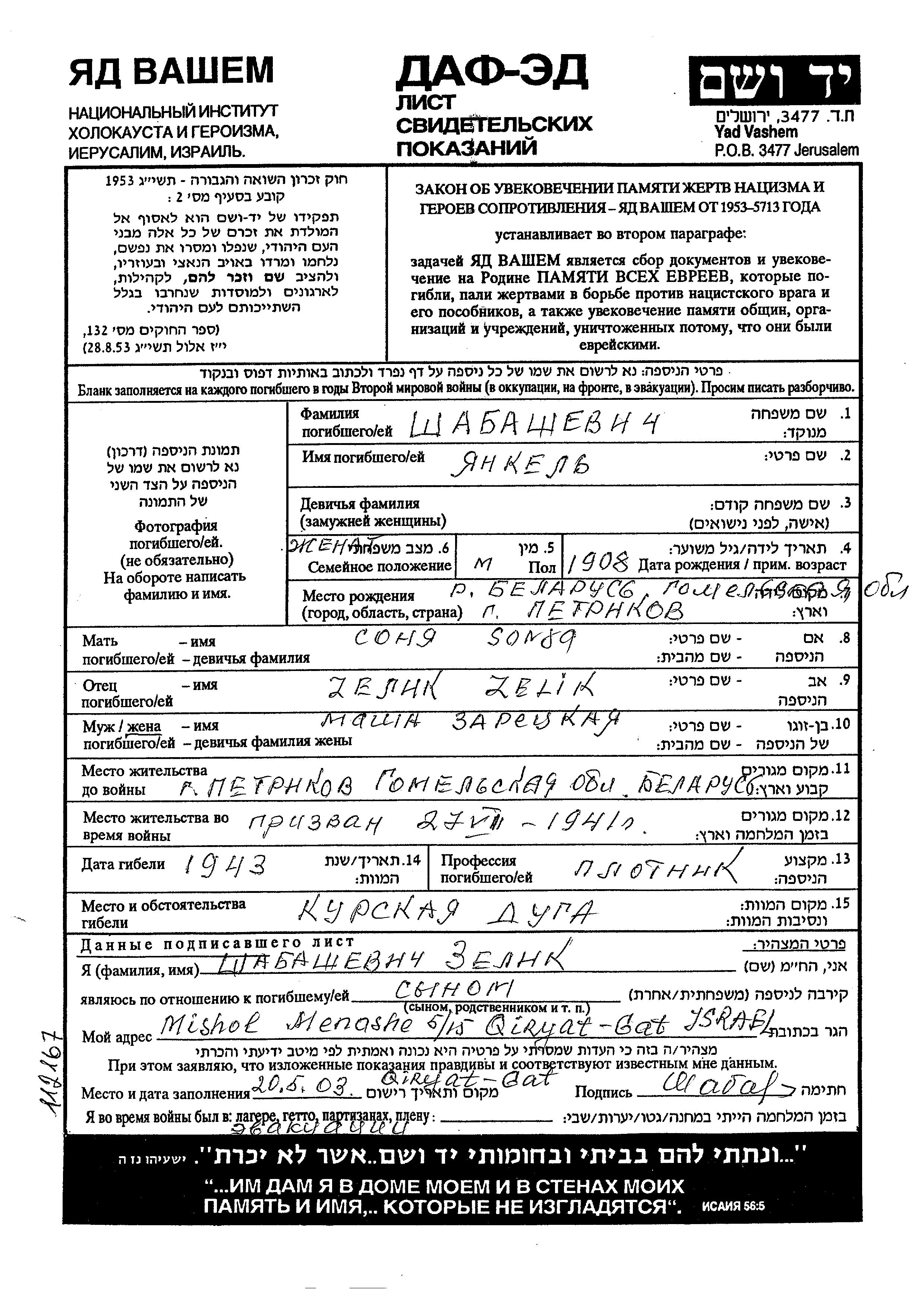 Shabashevich Yankel 1908 Petrikov, Bélorussie (URSS) Feuille de témoignage