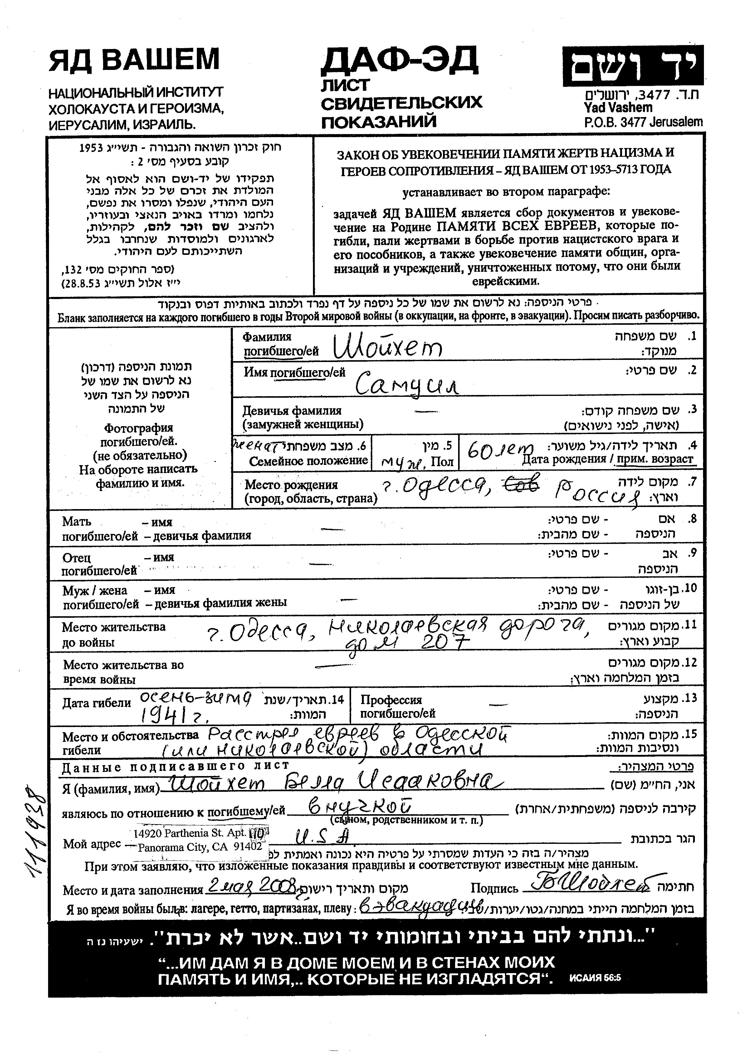 Shoikhet Samuil 1881 Odessa, Ukraine (URSS) Feuille de témoignage