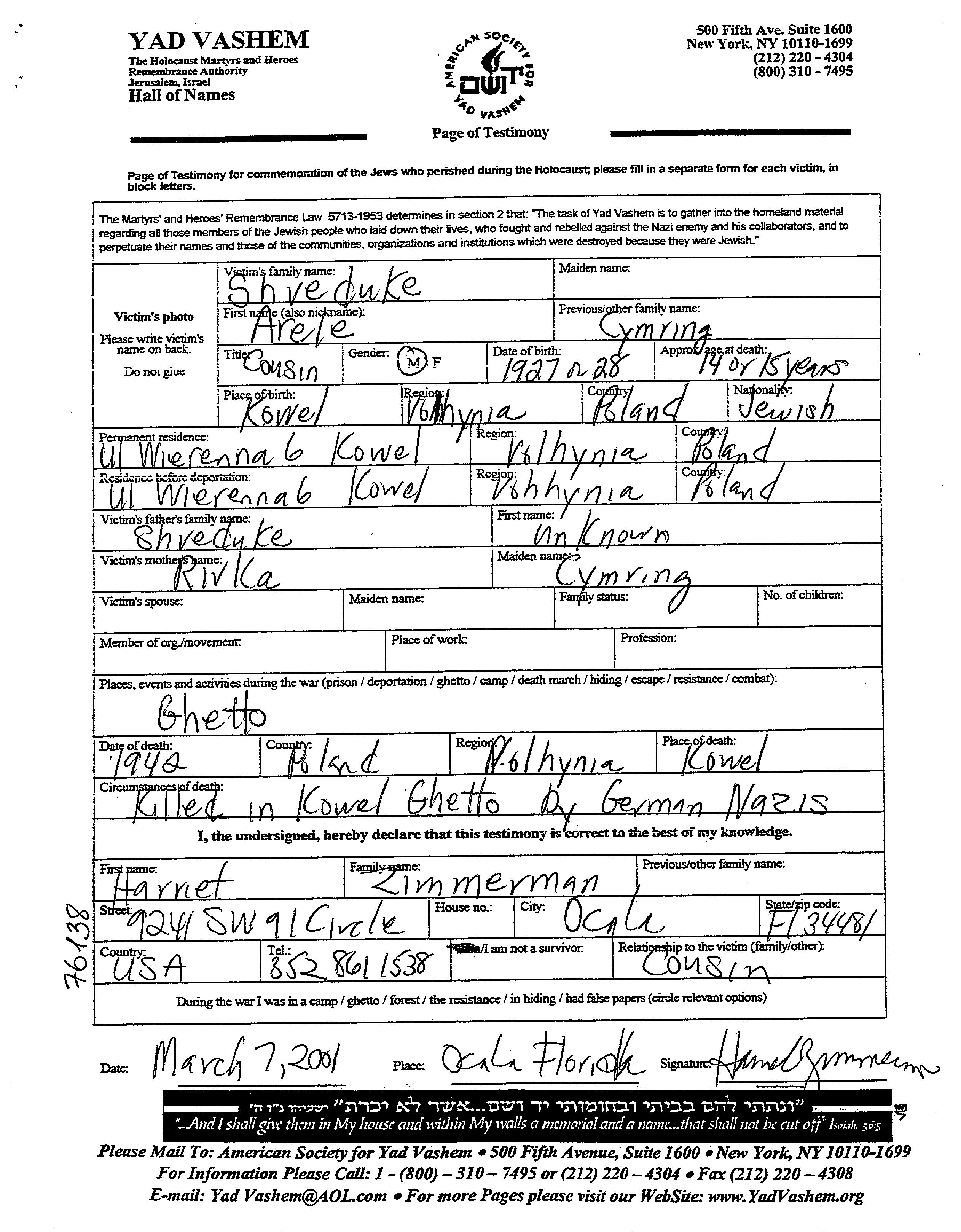 Arele Shveduke est né à Kowel, Pologne en 1928, fils de Rivka née Cymring. Il était Enfant. Avant la seconde guerre mondiale il vivait à Kowel, Pologne. Au cours de la guerre, il était à Kowel, Pologne.