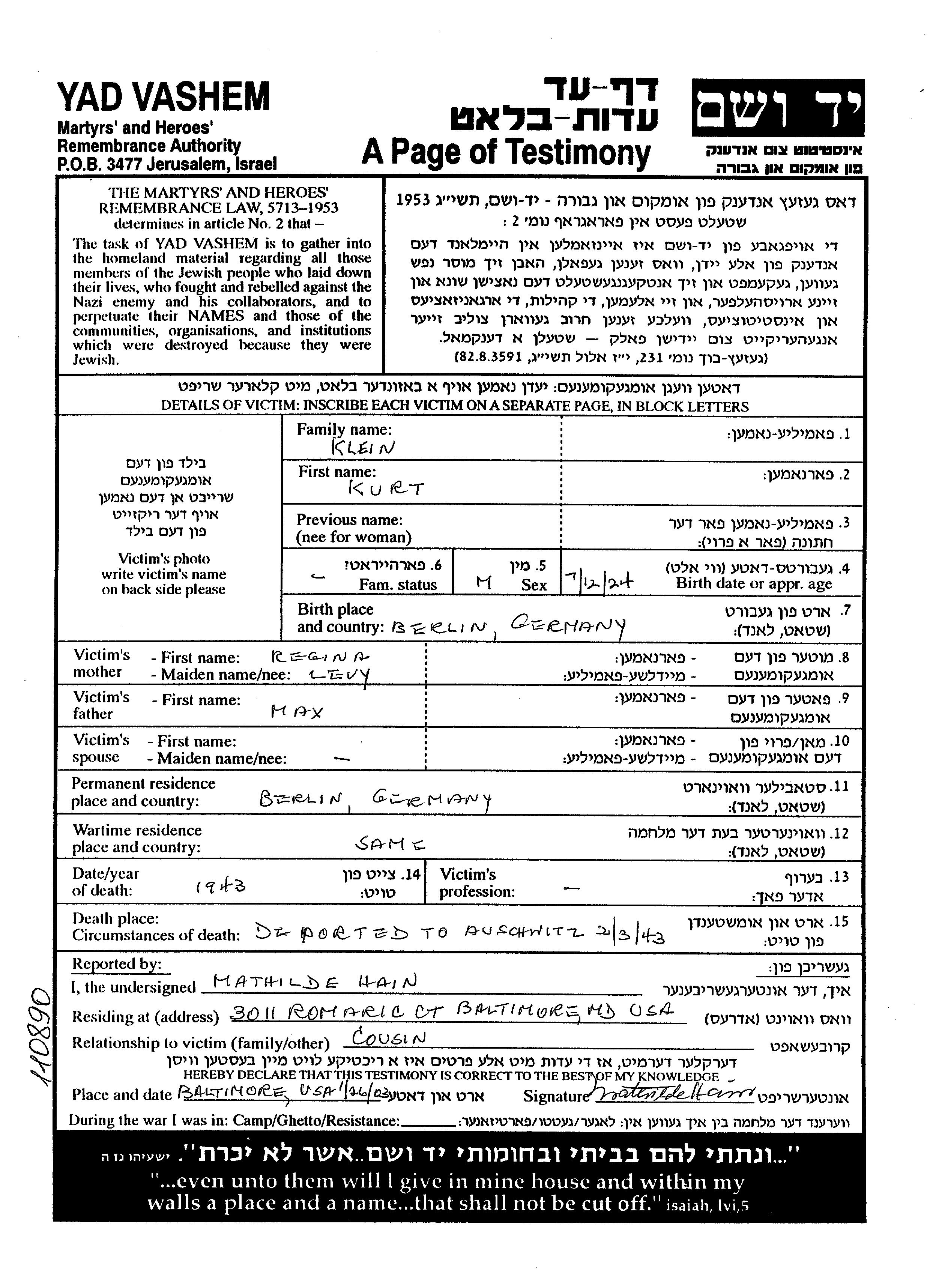 Klein Kurt 1924 Berlin, Allemagne Feuille de témoignage