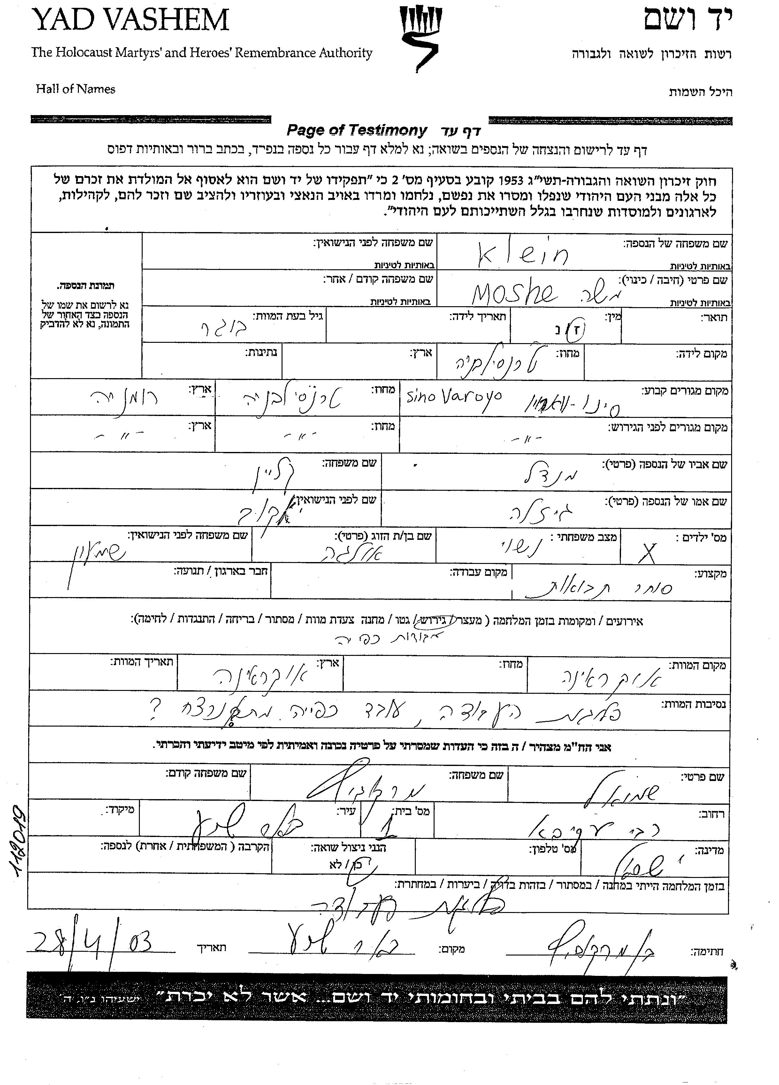 Moshe Klein est né à Transylvania, Roumanie, fils de Mendel et de Gizela née Iakov. Il était Négociant en grain et Mariée à Olga née Shimon. Avant la seconde guerre mondiale il vivait à Sinovir, Tchécoslovaquie.