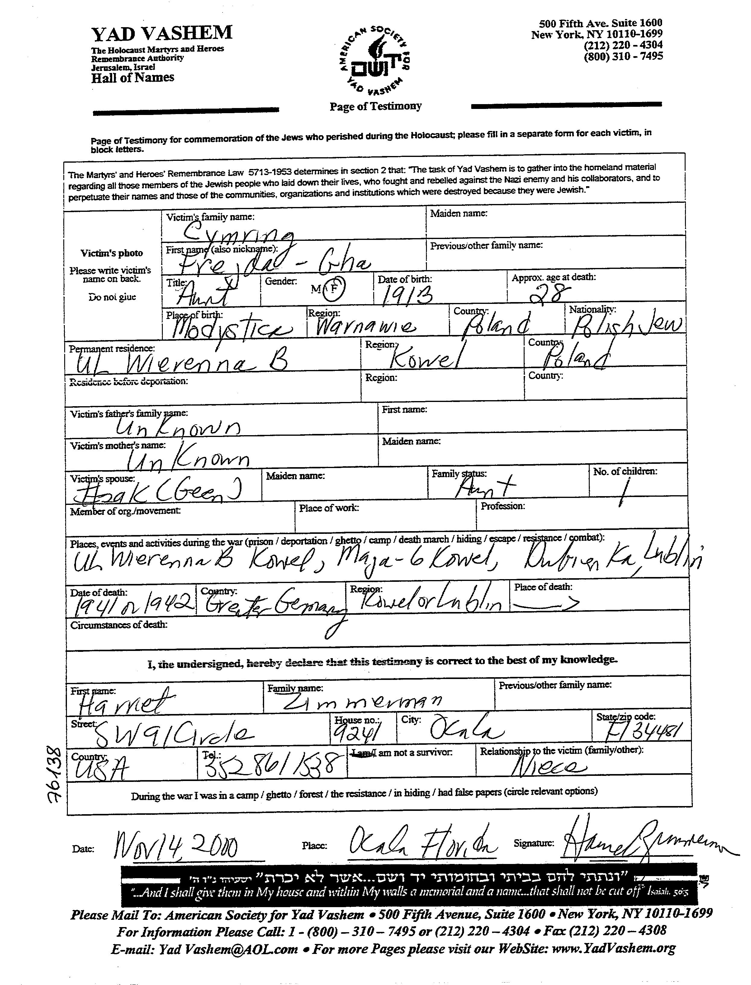 Yad Vashem - Pages of Testimony Names Memorial Collection