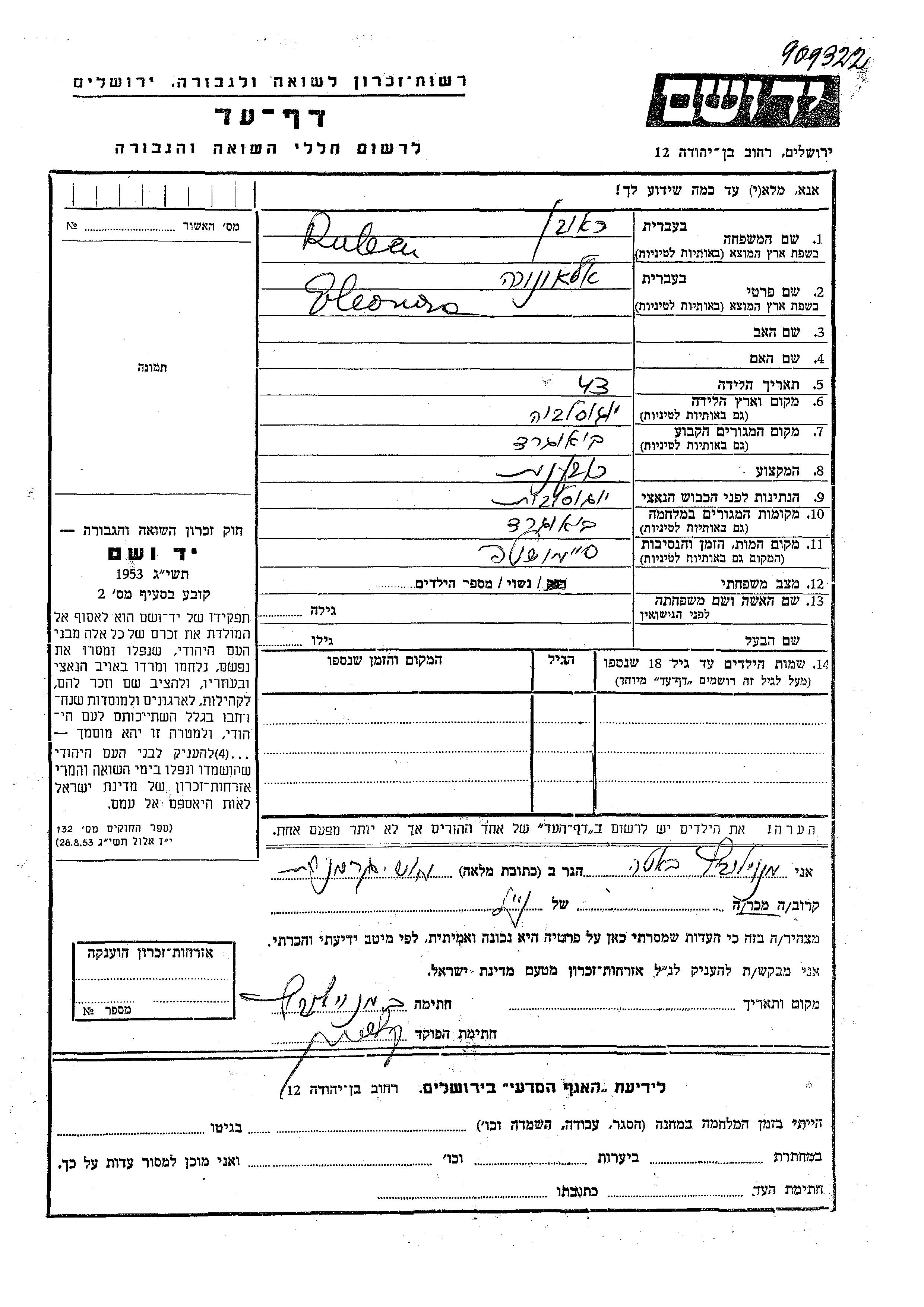Ruben Eleonora Beograd, Yugoslavie Feuille de témoignage