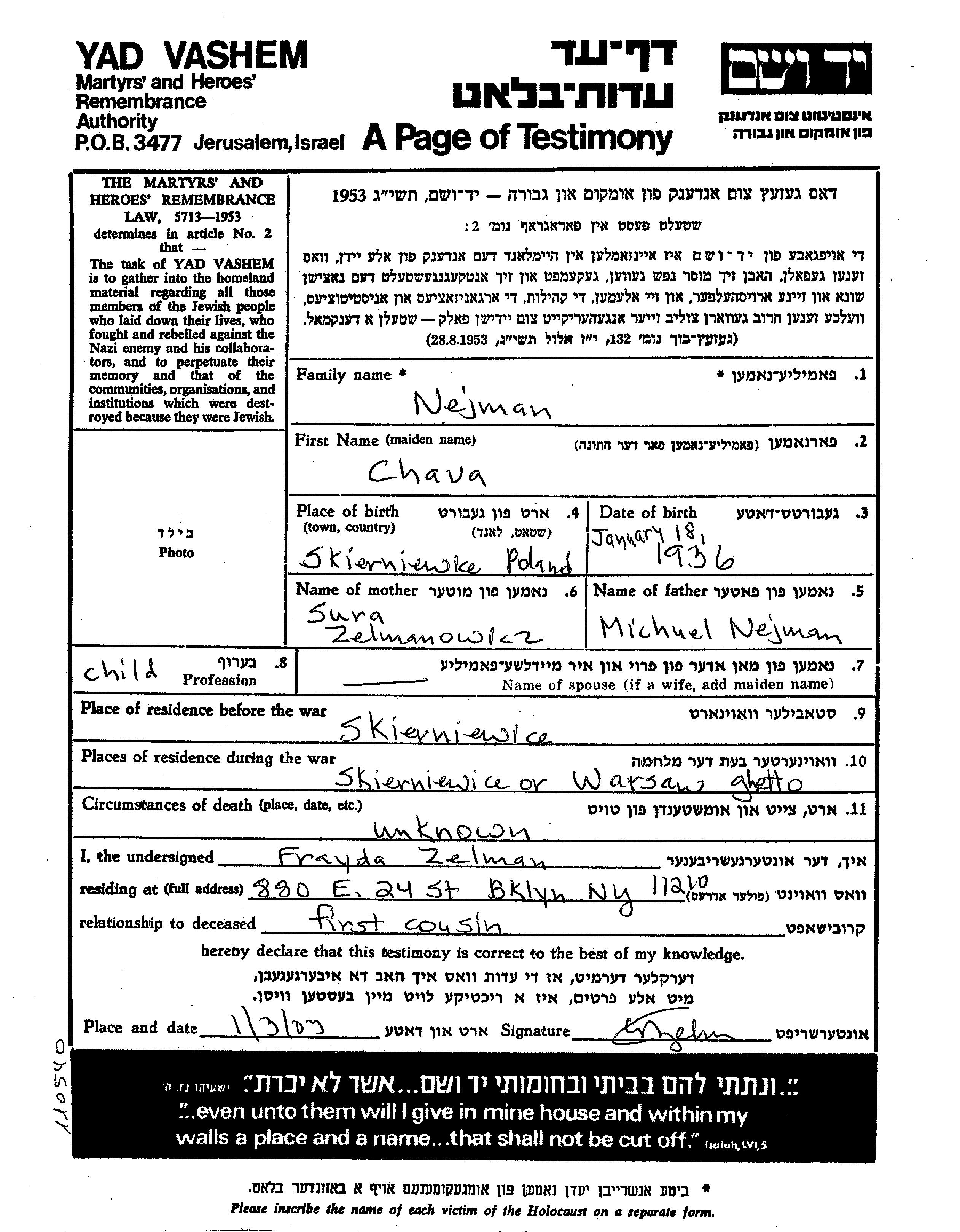 Nejman Chava 1936 Skierniewice, Pologne Feuille de témoignage