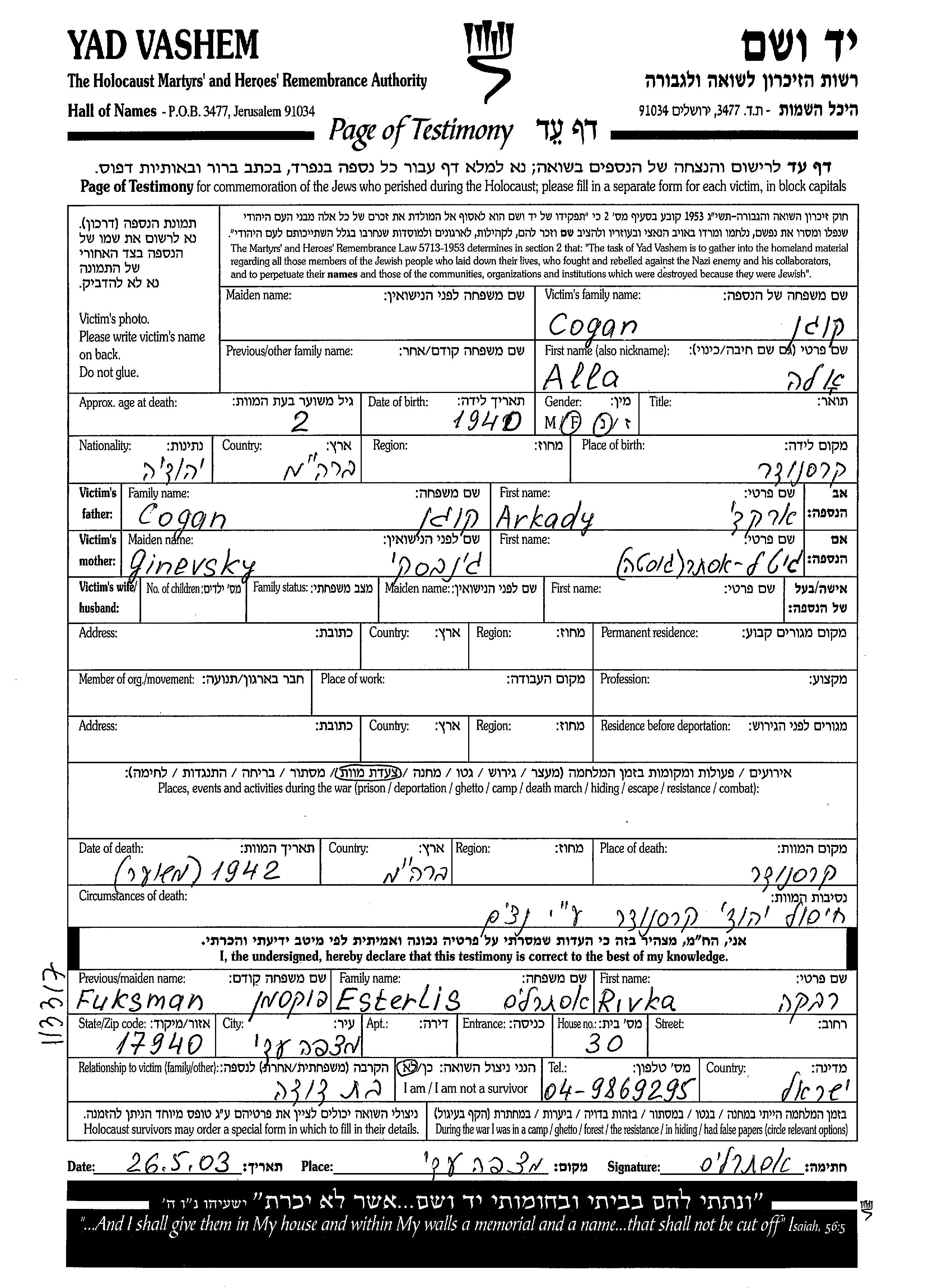 Cogan Alla 1940 endroit inconnu, Feuille de témoignage