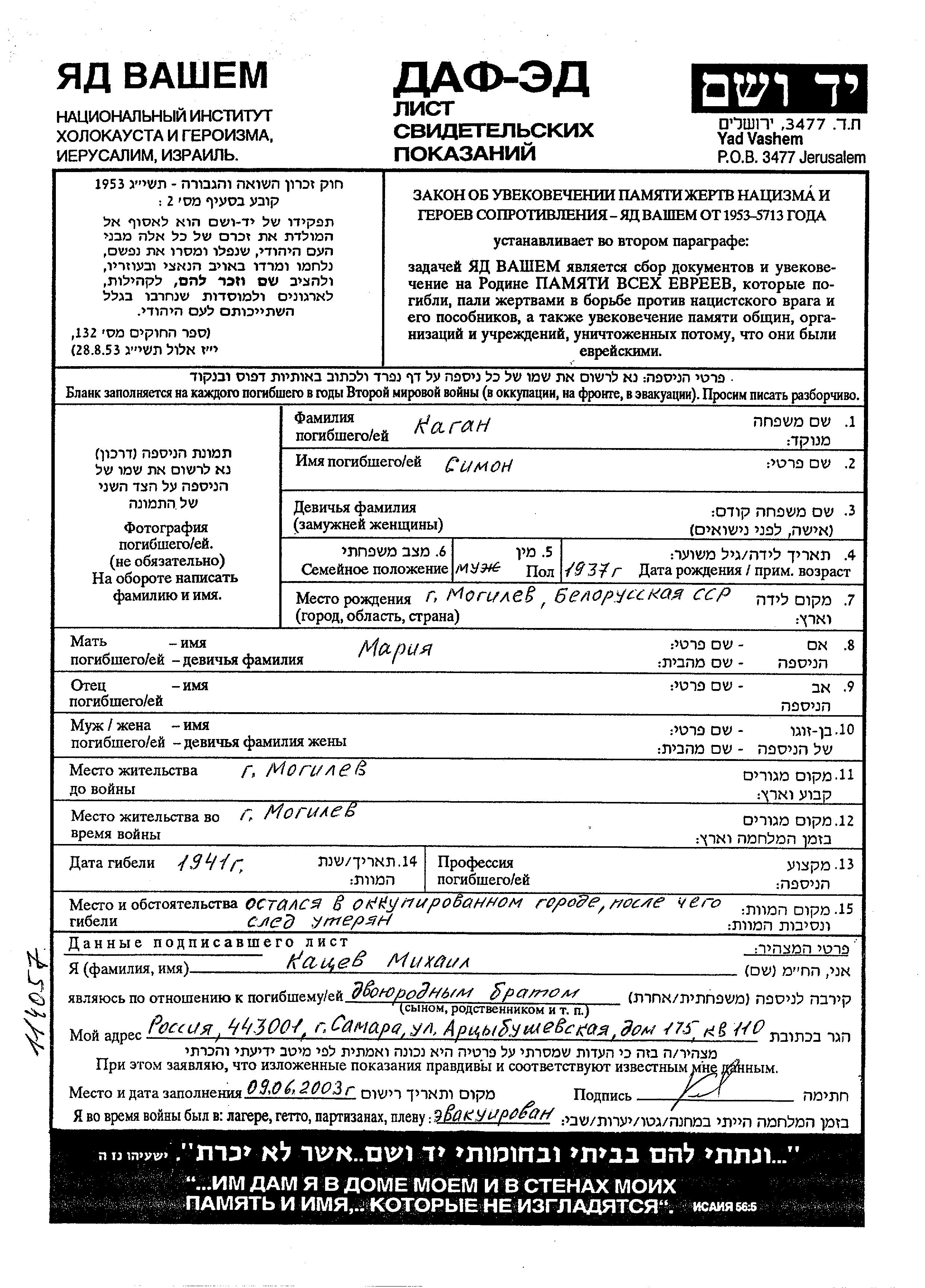 Kagan Simon 1937 Mogilev, Bélorussie (URSS) Feuille de témoignage