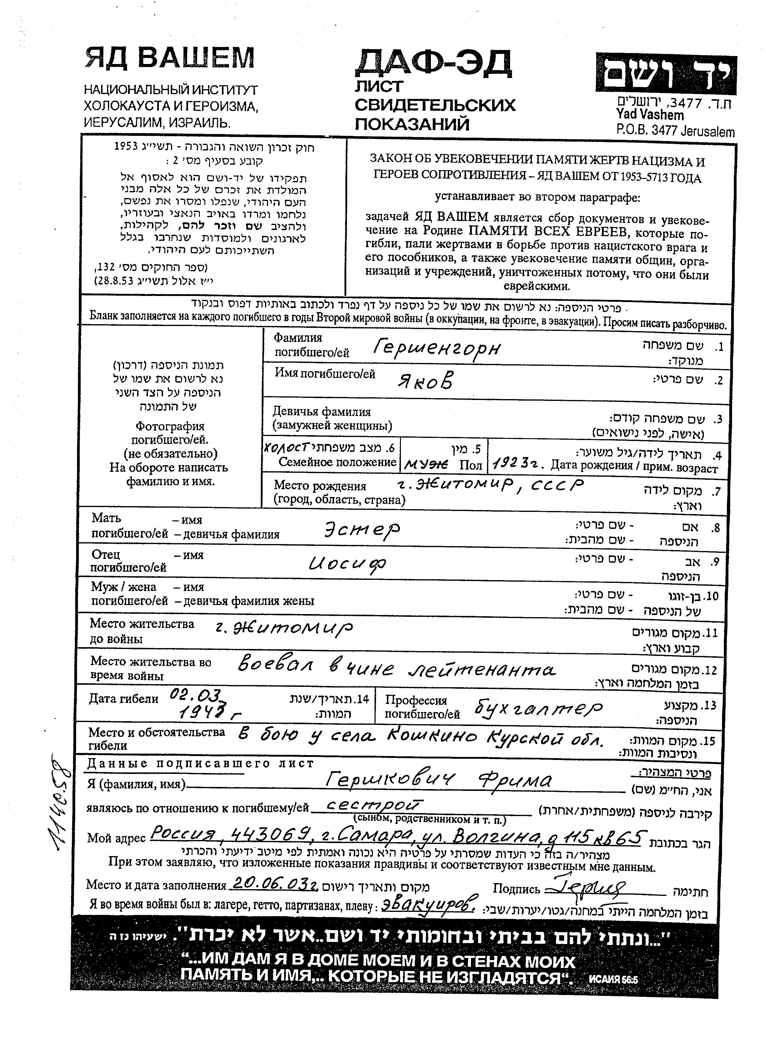 Gershengorn Yakov 1923 Zhitomir, Ukraine (URSS) Feuille de témoignage