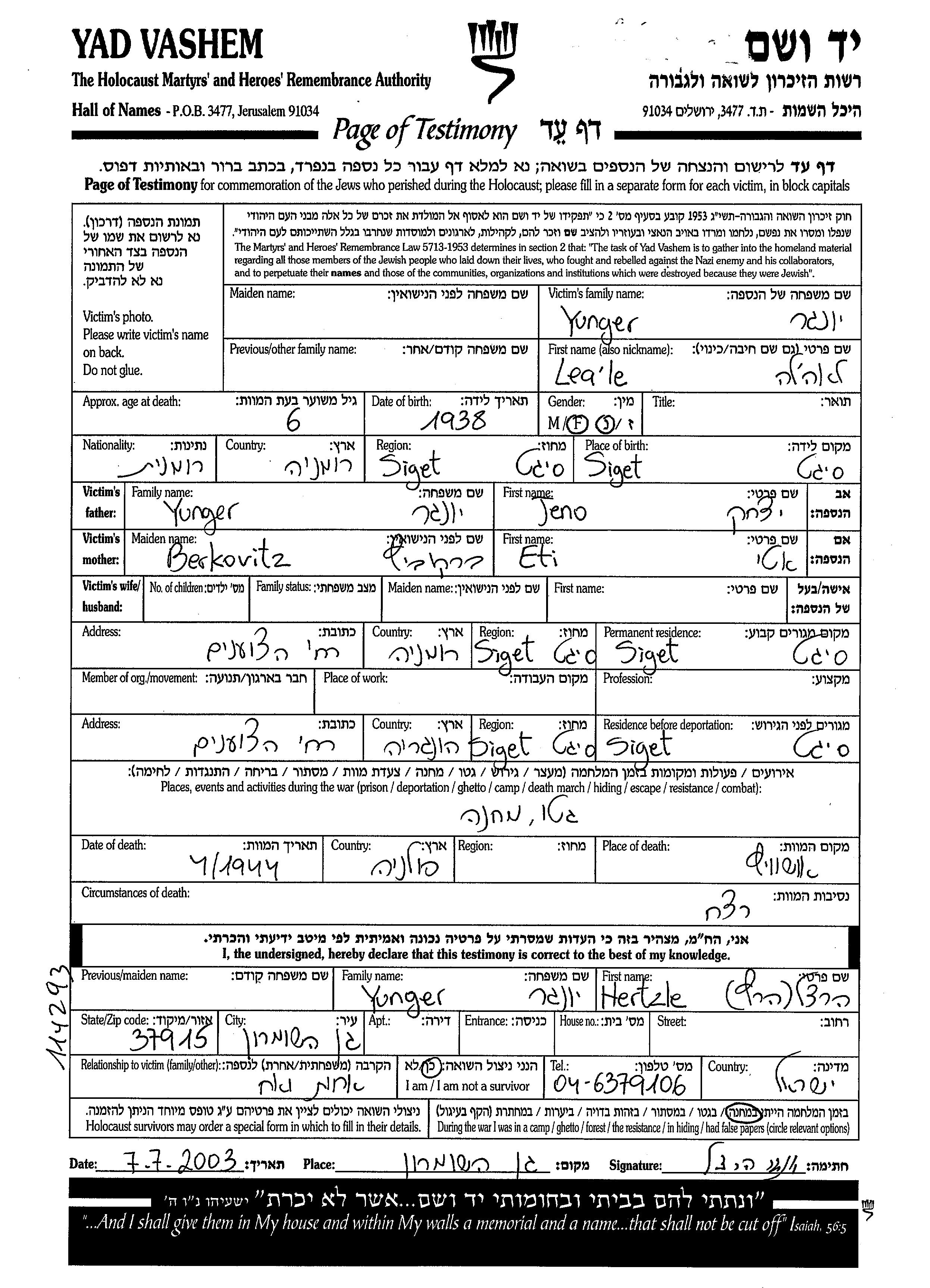 Yunger Leale 1938 Siget, Roumanie Feuille de témoignage