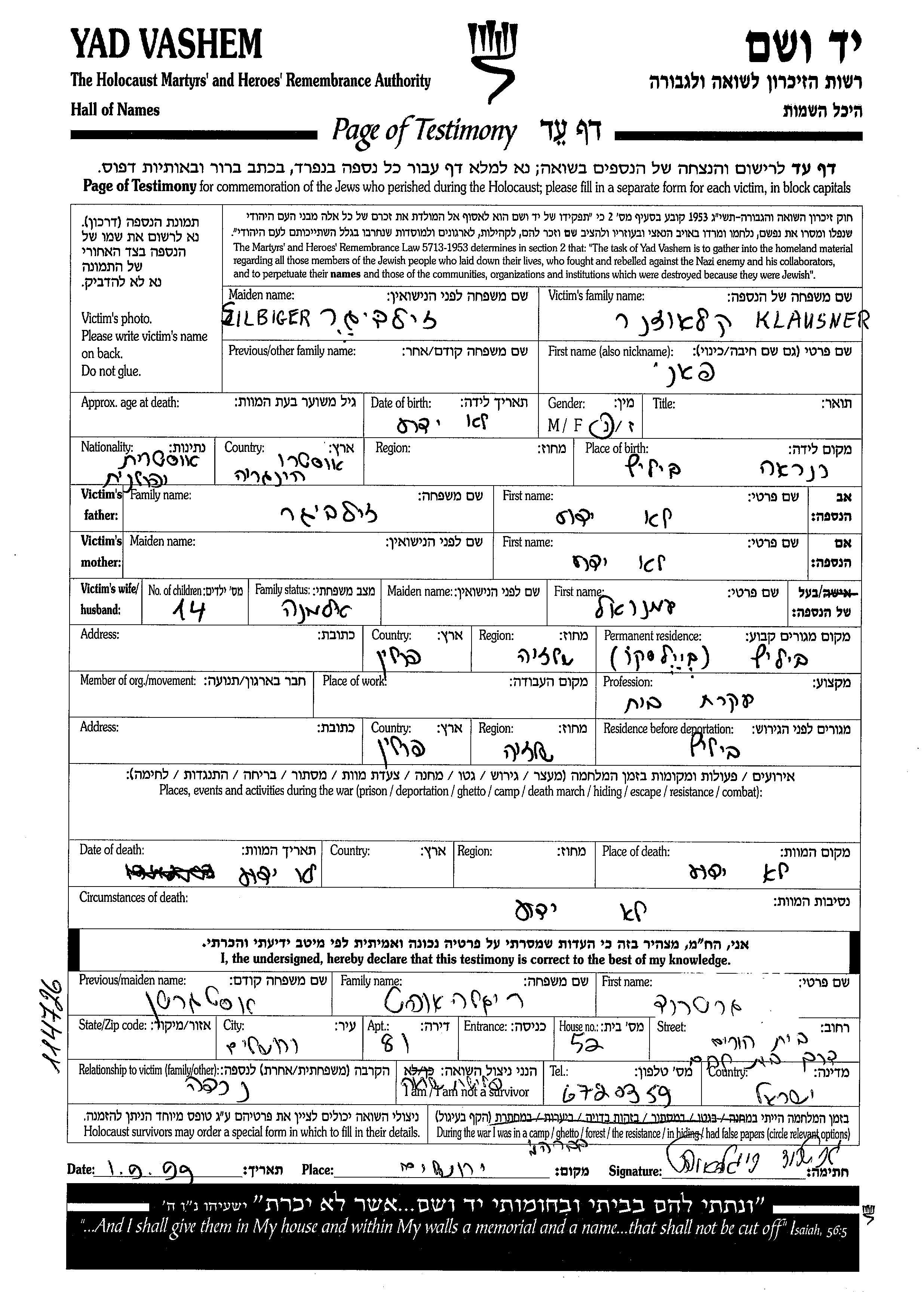 Klausner Fani Bielsko, Pologne Feuille de témoignage