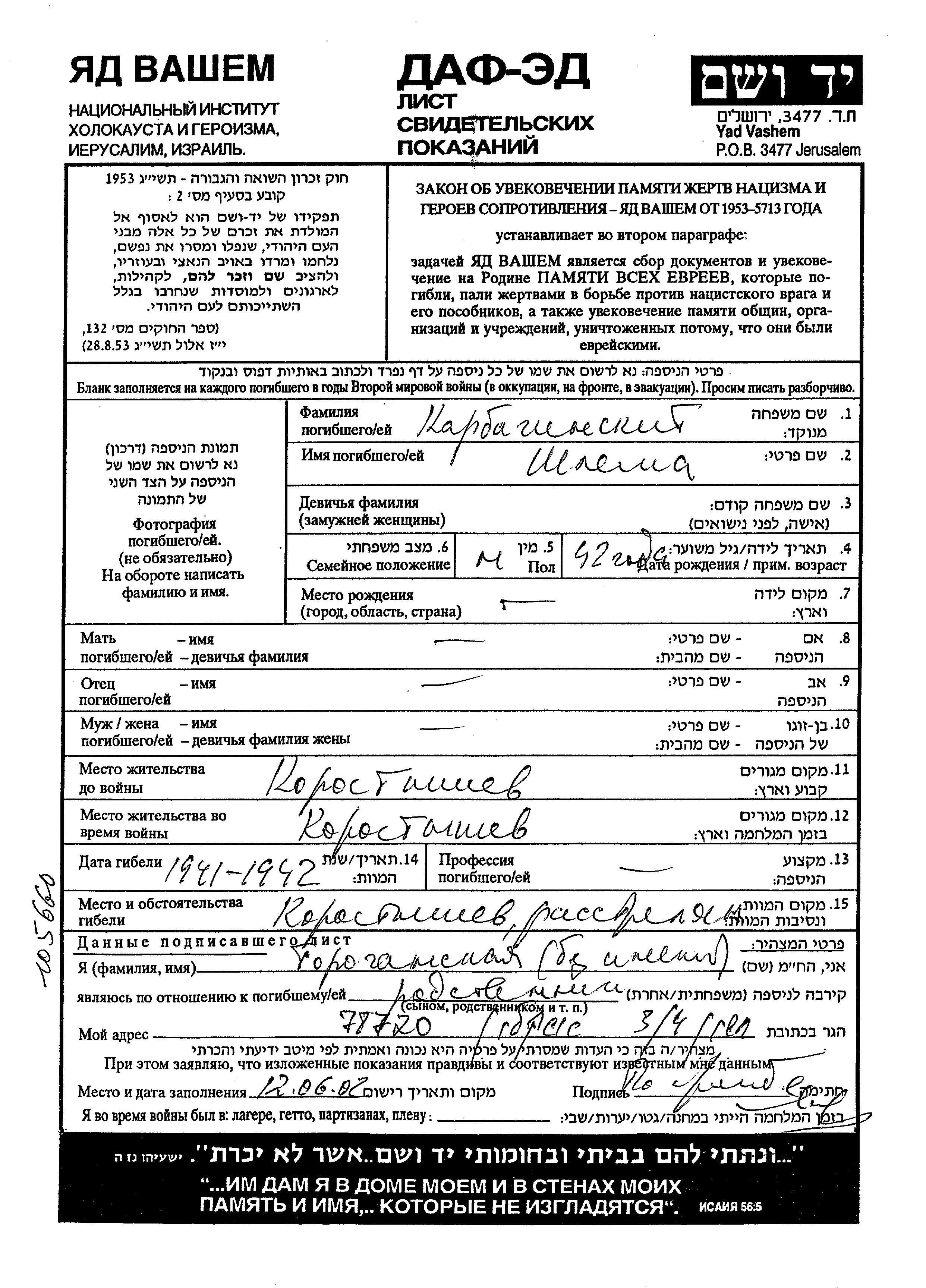 Karbachinski Shlyoma 1899 Korostishov, Ukraine (URSS) Feuille de témoignage