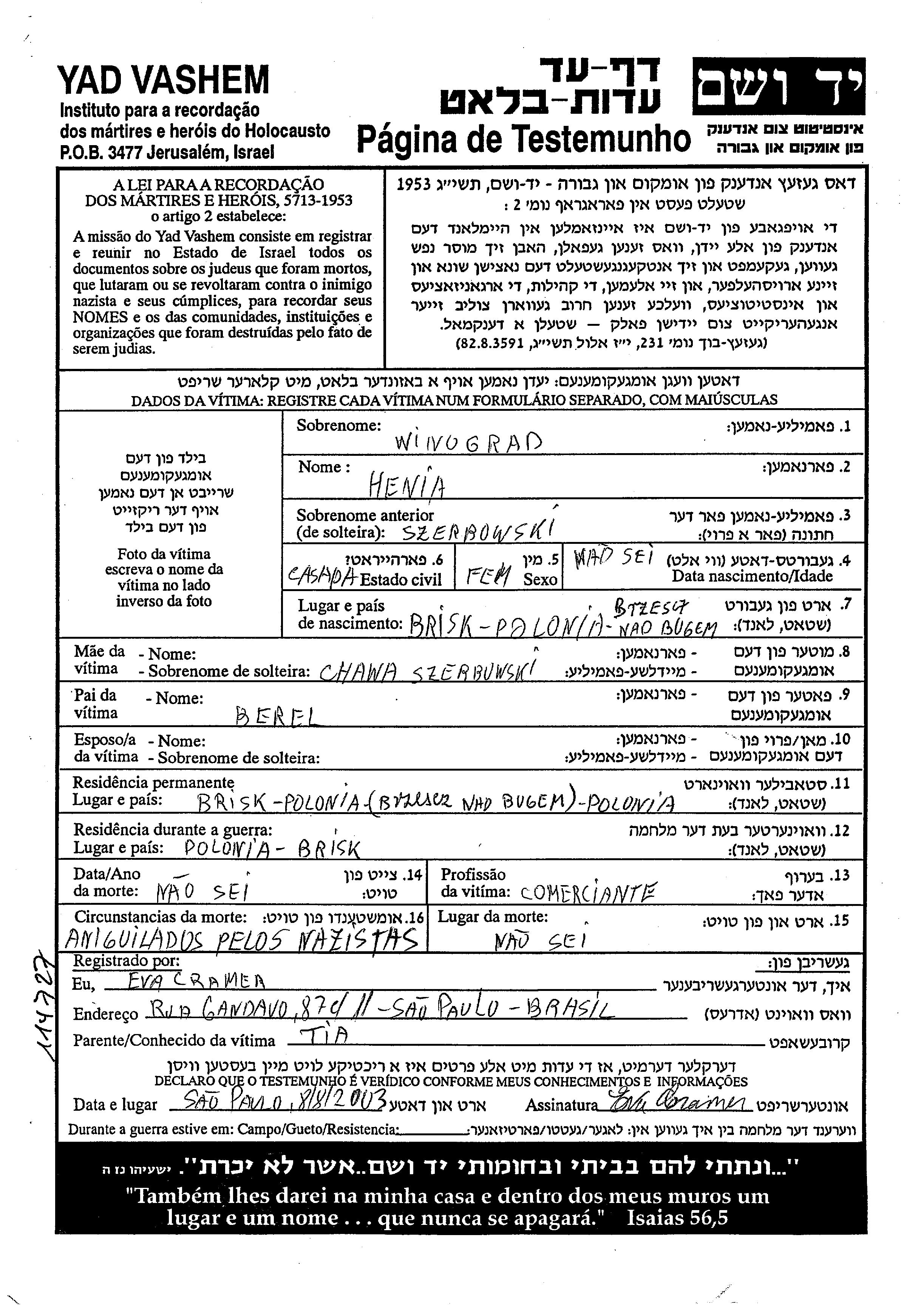 Winograd Henia Brisk, Pologne Feuille de témoignage
