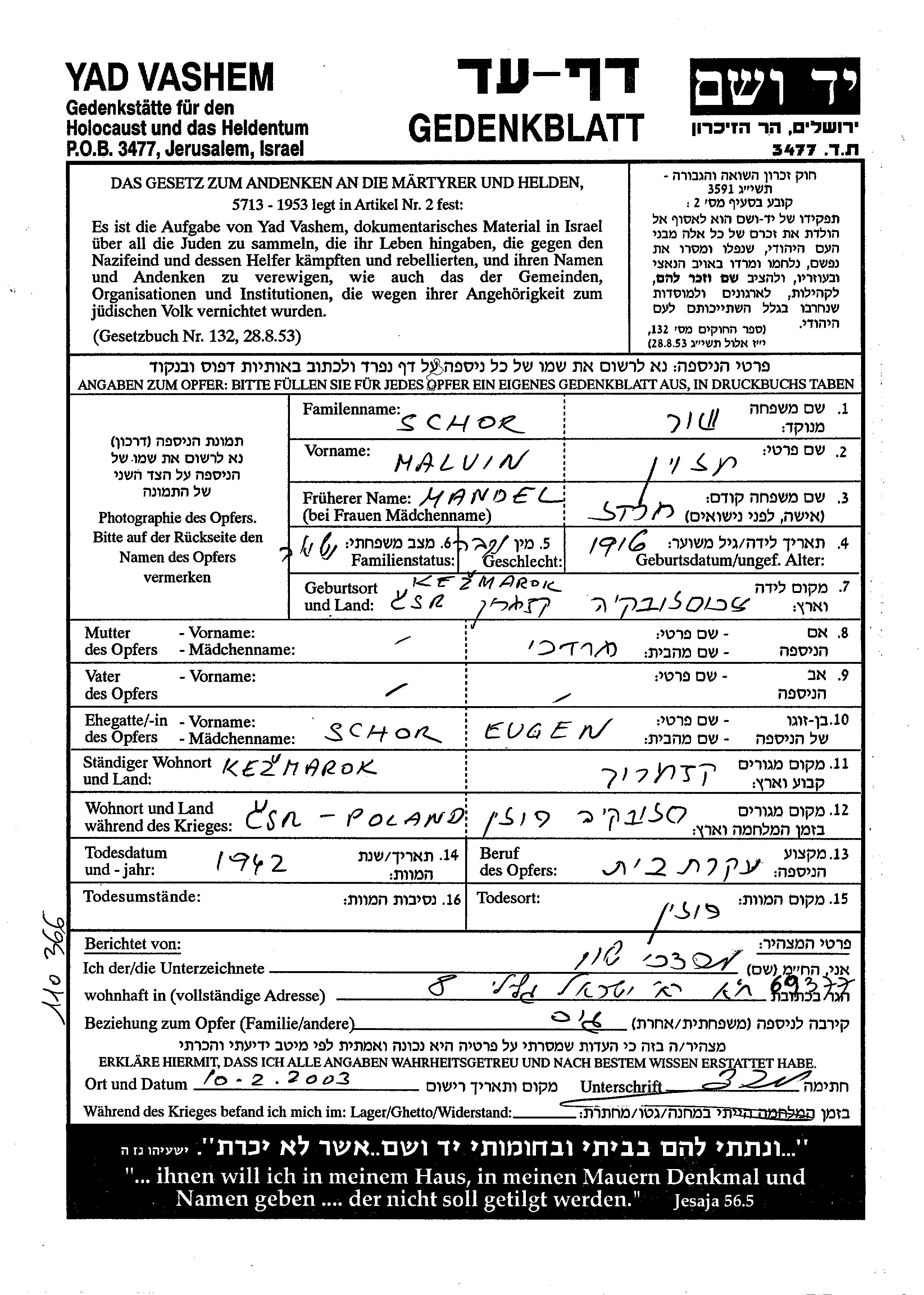 Malvin Shur née Mandel est née à Kezmarok, Tchécoslovaquie en 1916, fille de Mordekhai. Elle était Femme au foyer et Mariée à Eugen. Avant la seconde guerre mondiale elle vivait à Kezmarok, Tchécoslovaquie. Pendant la guerre, elle était à Pologne.
