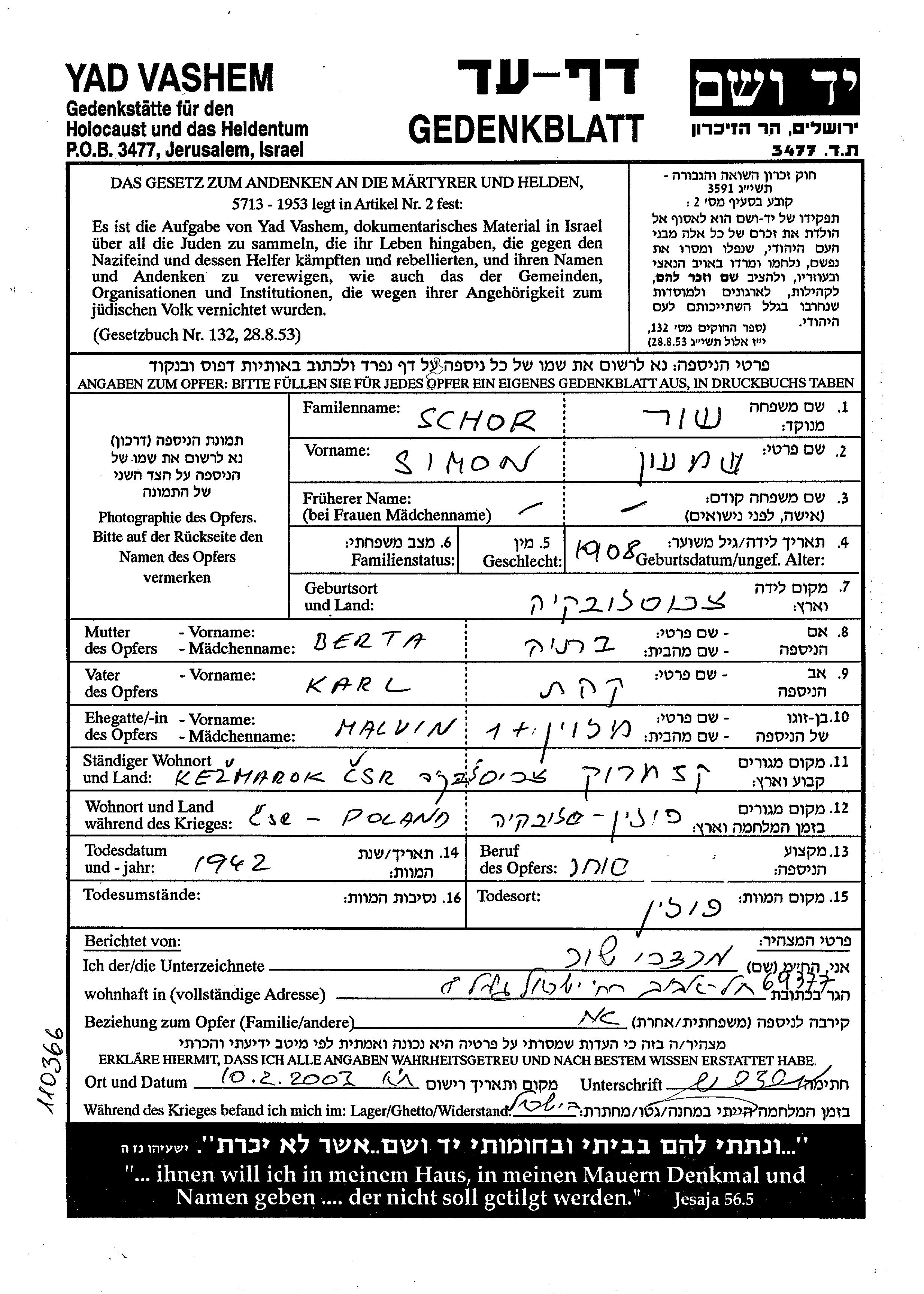 Simon Schor est né à Tchécoslovaquie en 1908, fils de Kahat Karl et de Berta Batia. Il était Commerçant/e et Mariée à Malvin. Avant la seconde guerre mondiale il vivait à Kezmarok, Tchécoslovaquie. Au cours de la guerre, il était à Tchécoslovaquie.