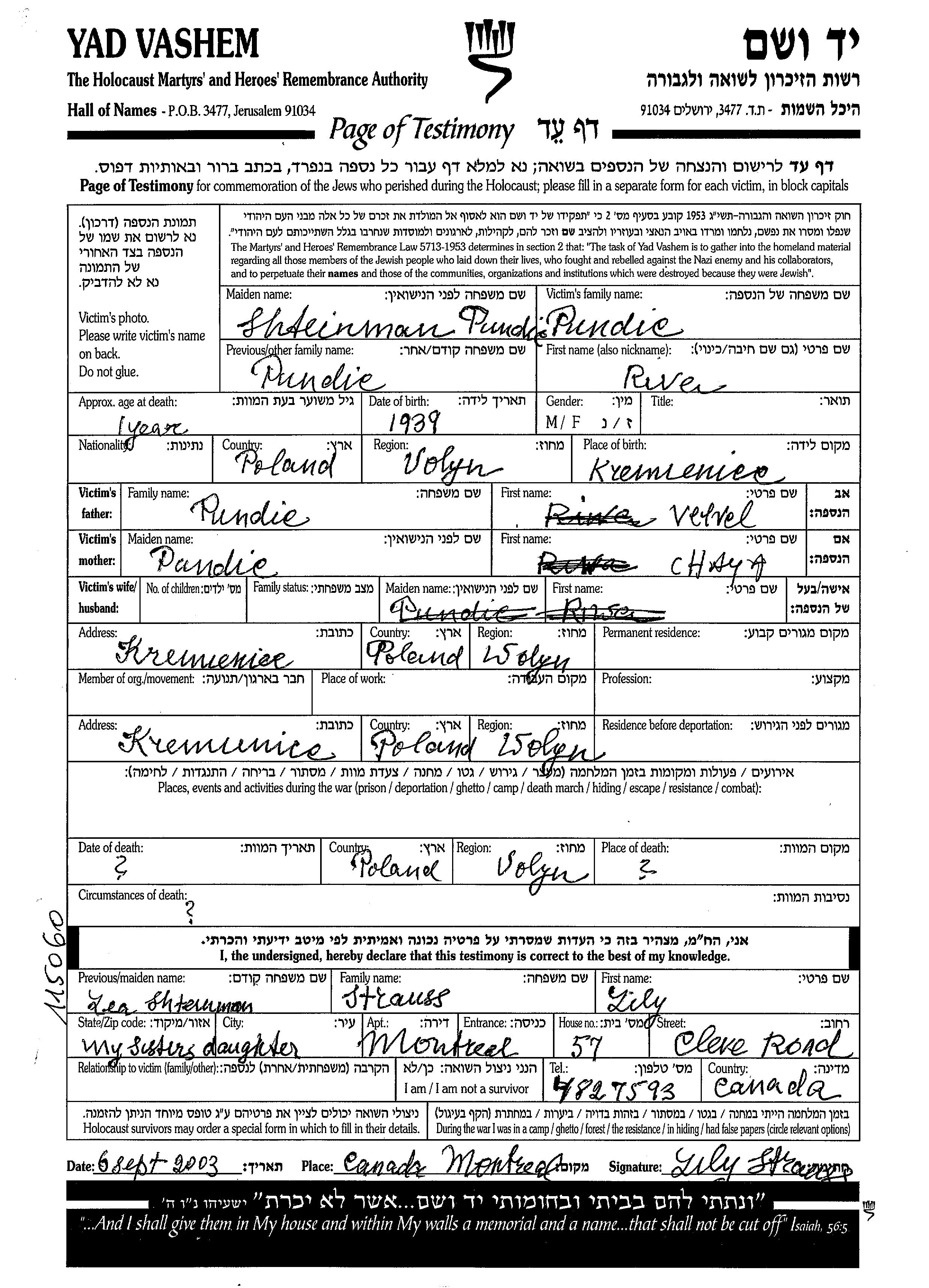Yad Vashem - Pages of Testimony Names Memorial Collection
