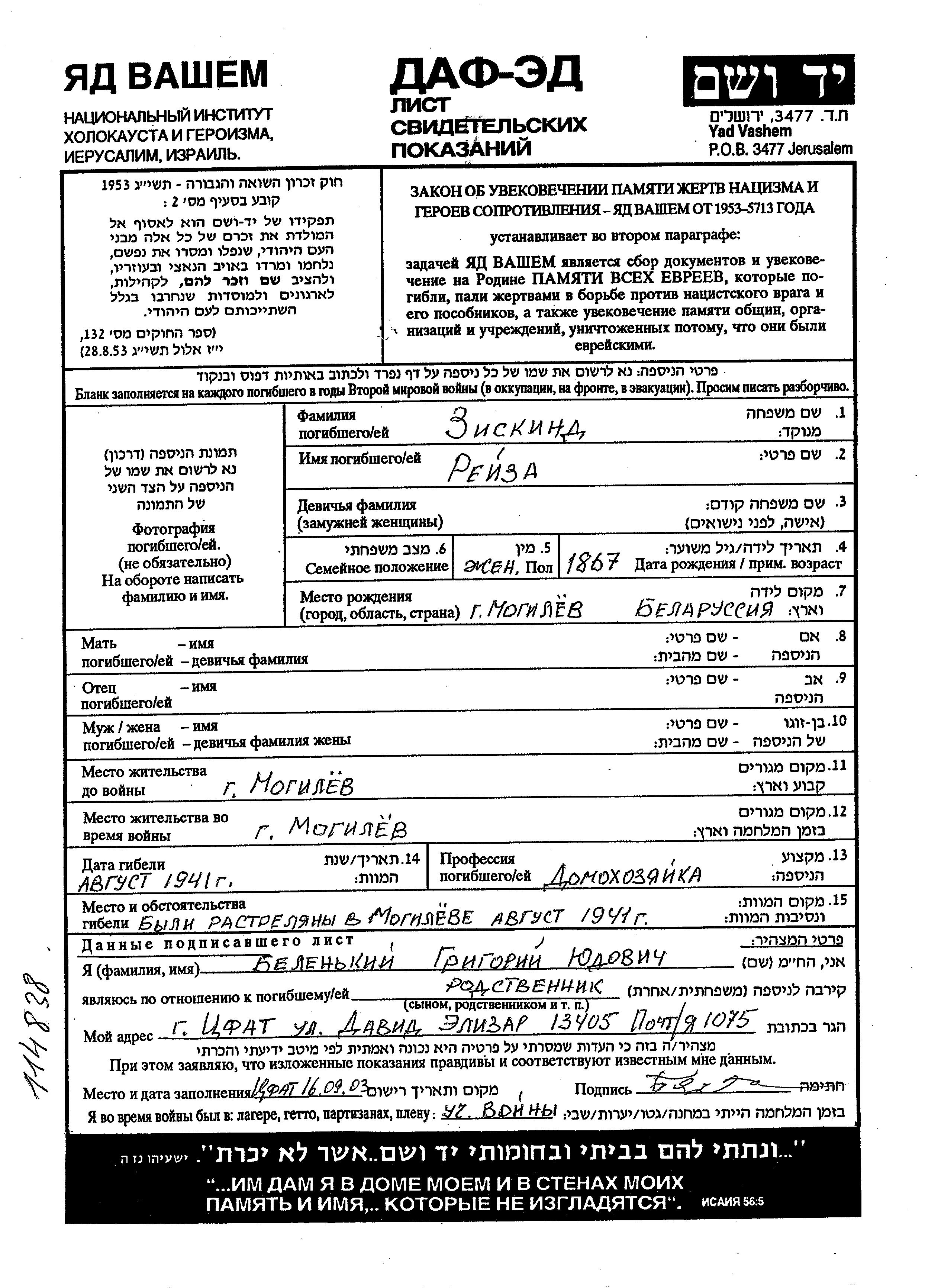 Ziskind Reiza 1867 Mogilev, Bélorussie (URSS) Feuille de témoignage