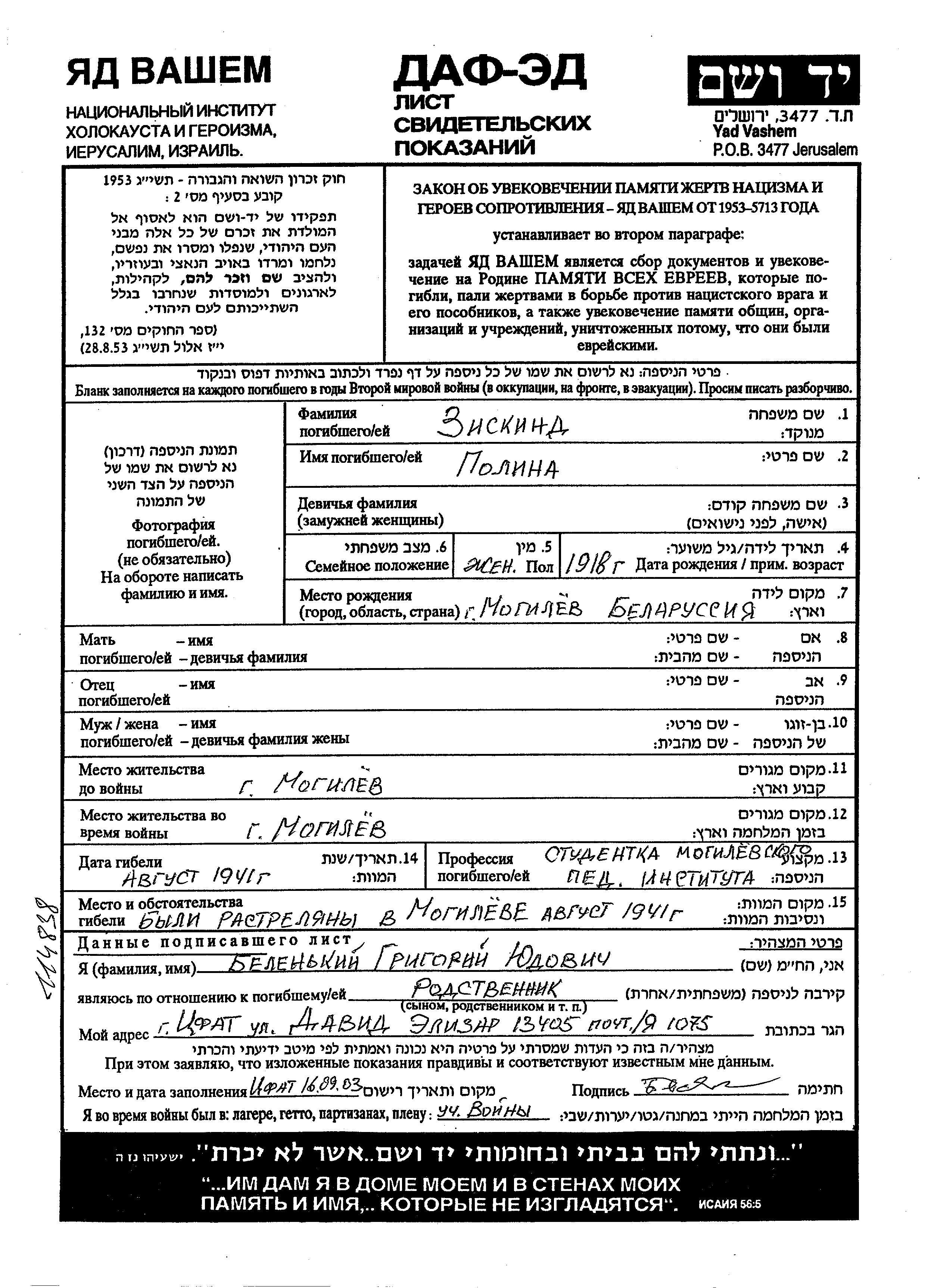 Ziskind Polina 1918 Mogilev, Bélorussie (URSS) Feuille de témoignage