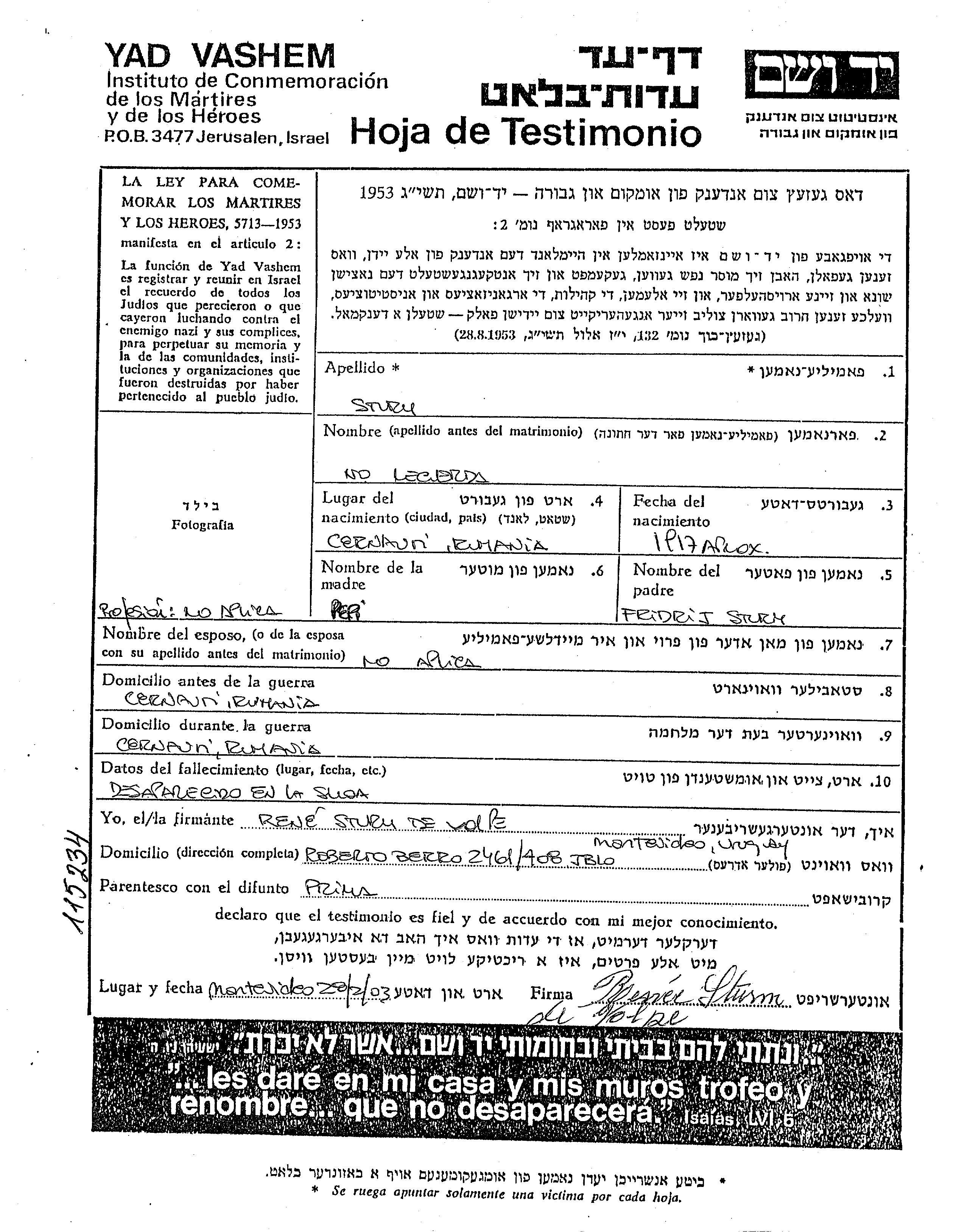 prénom inconnu Sturm est né en 1917, fils de Fridrij et de Pepi. Avant la seconde guerre mondiale il vivait à Cernauti, Roumanie. Au cours de la guerre, il était à Cernauti, Roumanie.