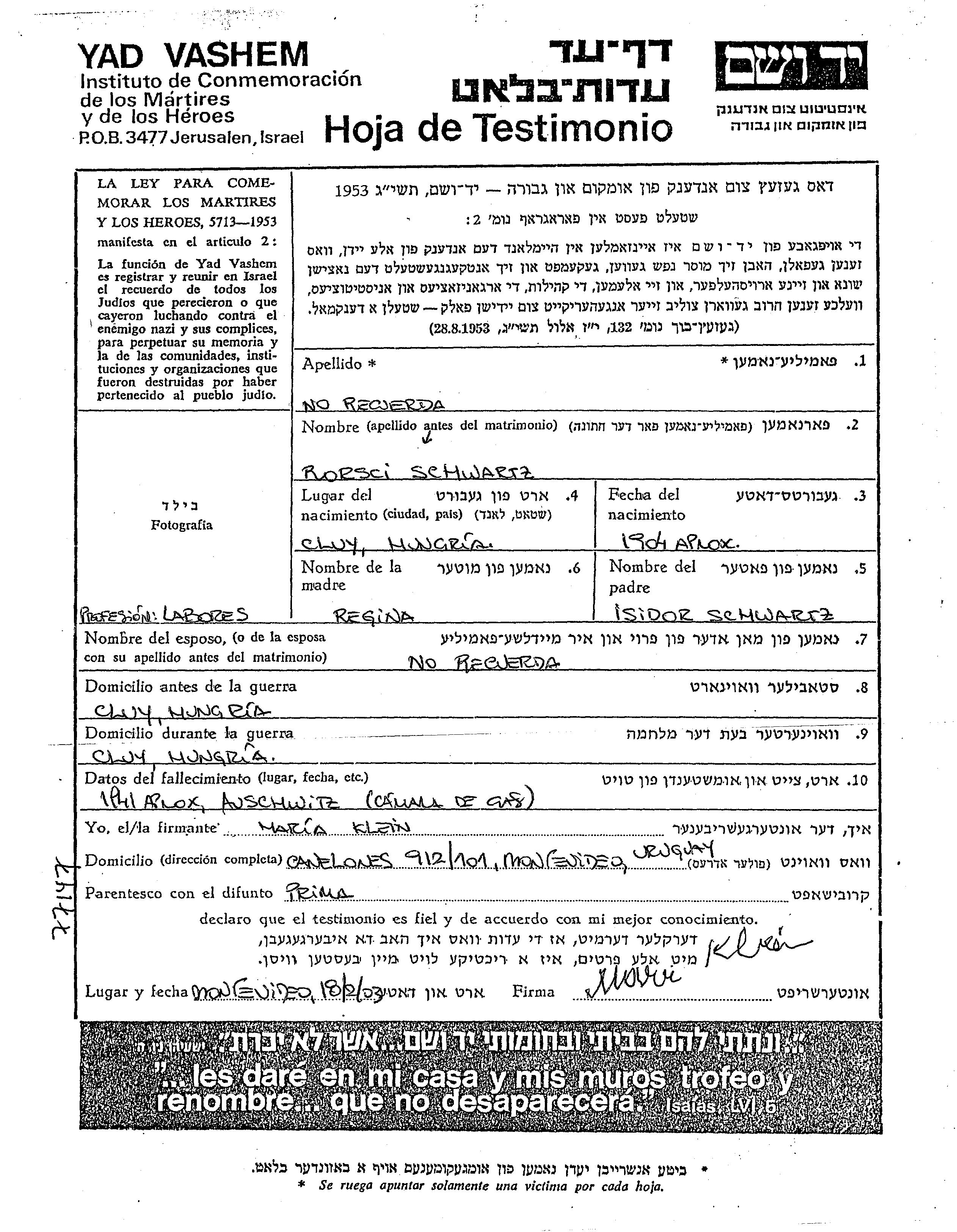 Schwartz Rorsci 1904 Cluj, Roumanie Feuille de témoignage