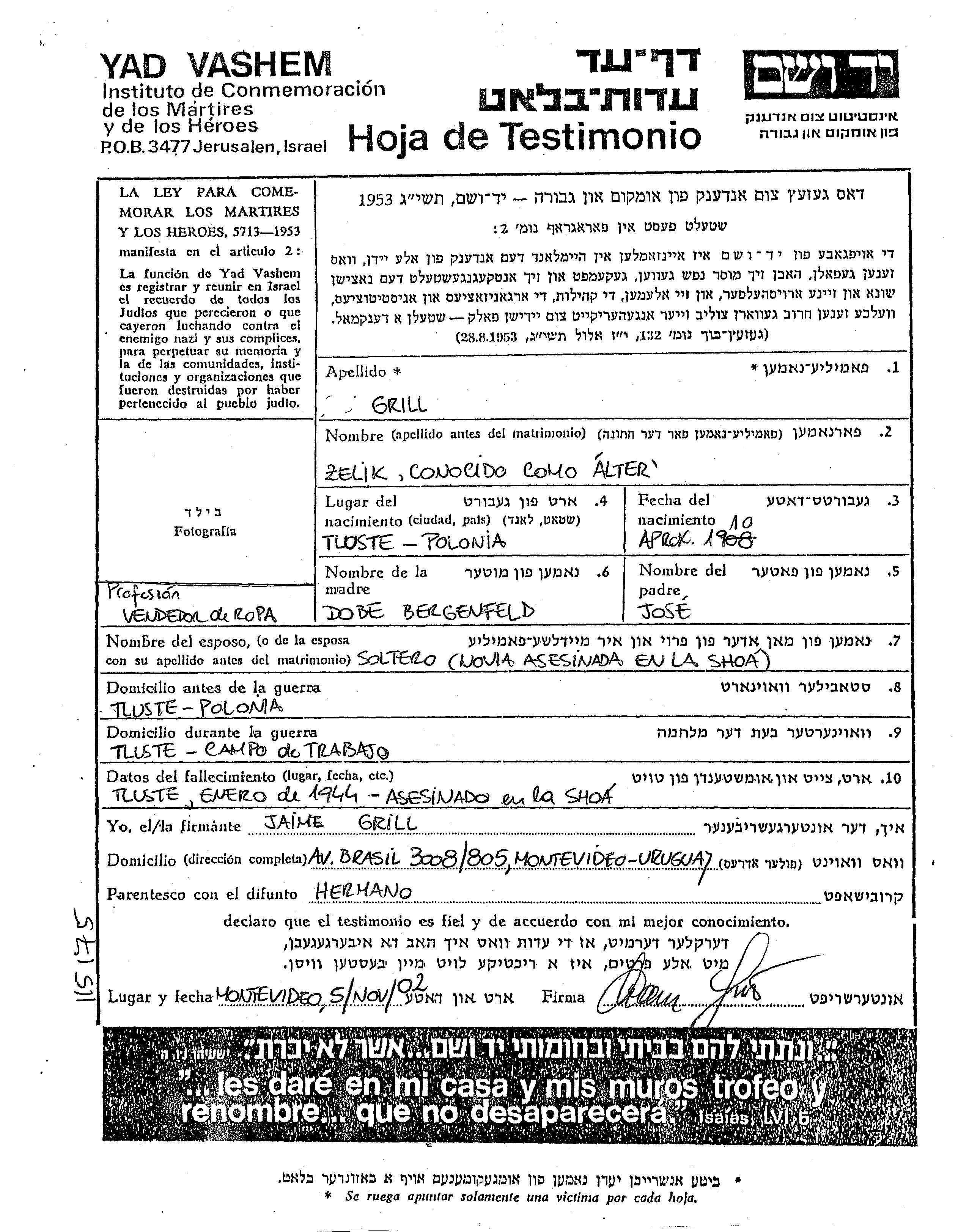 Alter Zelik Grill est né à Tluste, Pologne en 1910, fils de Jose et de Dobe née Bergenfeld. Il était Vendedor de ropa et veuf. Avant la seconde guerre mondiale il vivait à Tluste, Pologne. Au cours de la guerre, il était à Tluste, Pologne.
