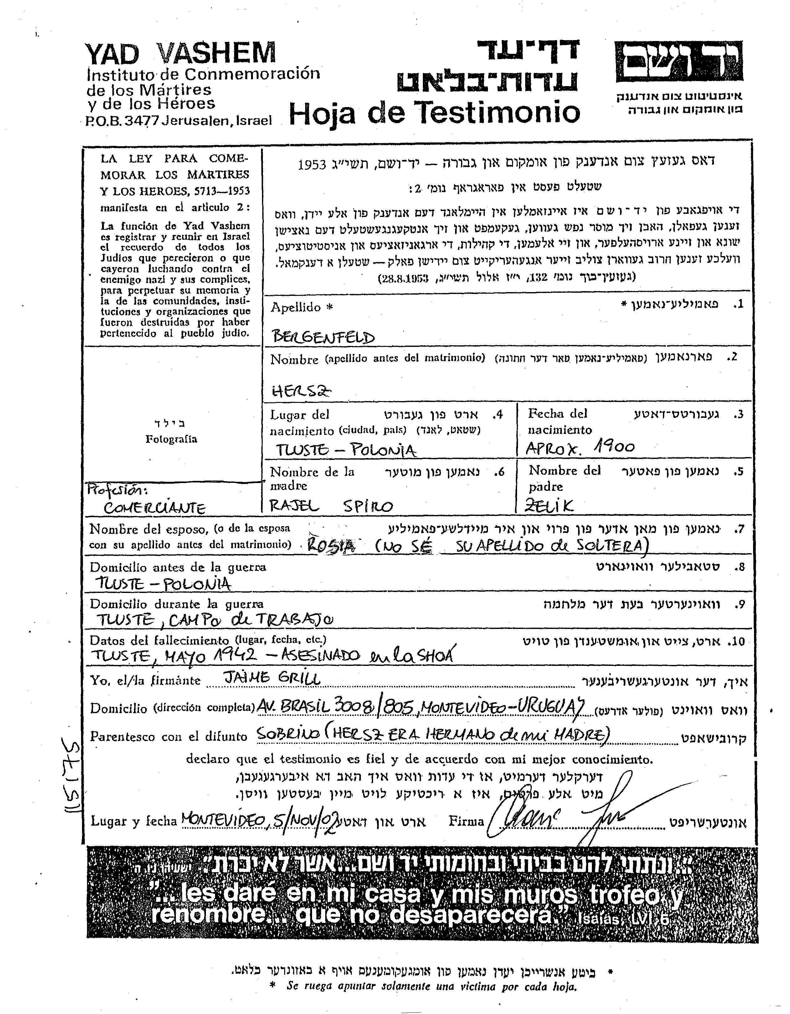Hersz Bergenfeld est né à Tluste, Pologne en 1900, fils de Zelik et de Rajel née Spiro. Il était Commerçant/e et Mariée à Rosia. Avant la seconde guerre mondiale il vivait à Tluste, Pologne. Au cours de la guerre, il était à Tluste, Pologne.