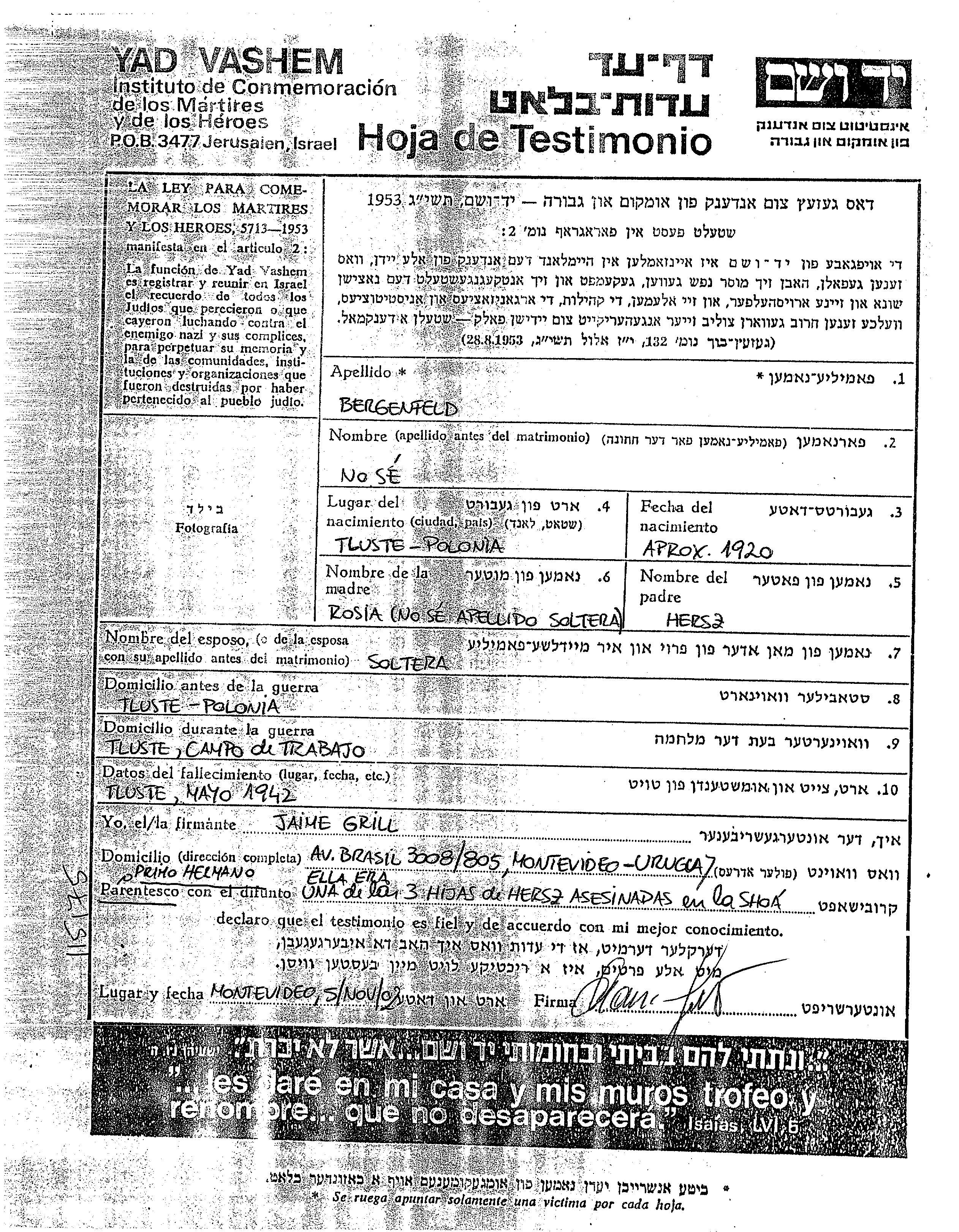 Bergenfeld prénom inconnu 1920 Tluste, Pologne Feuille de témoignage