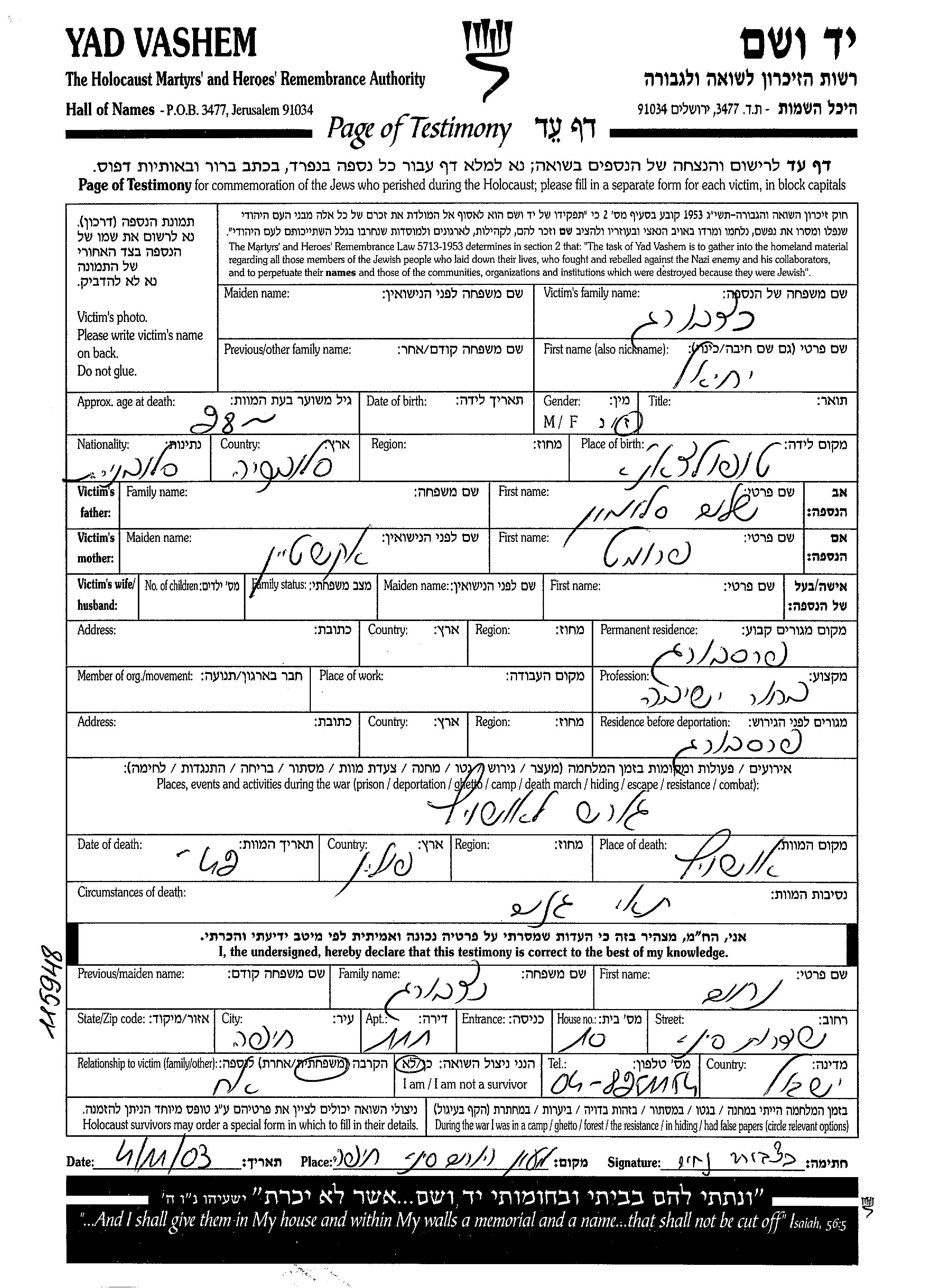 Yad Vashem - Pages of Testimony Names Memorial Collection