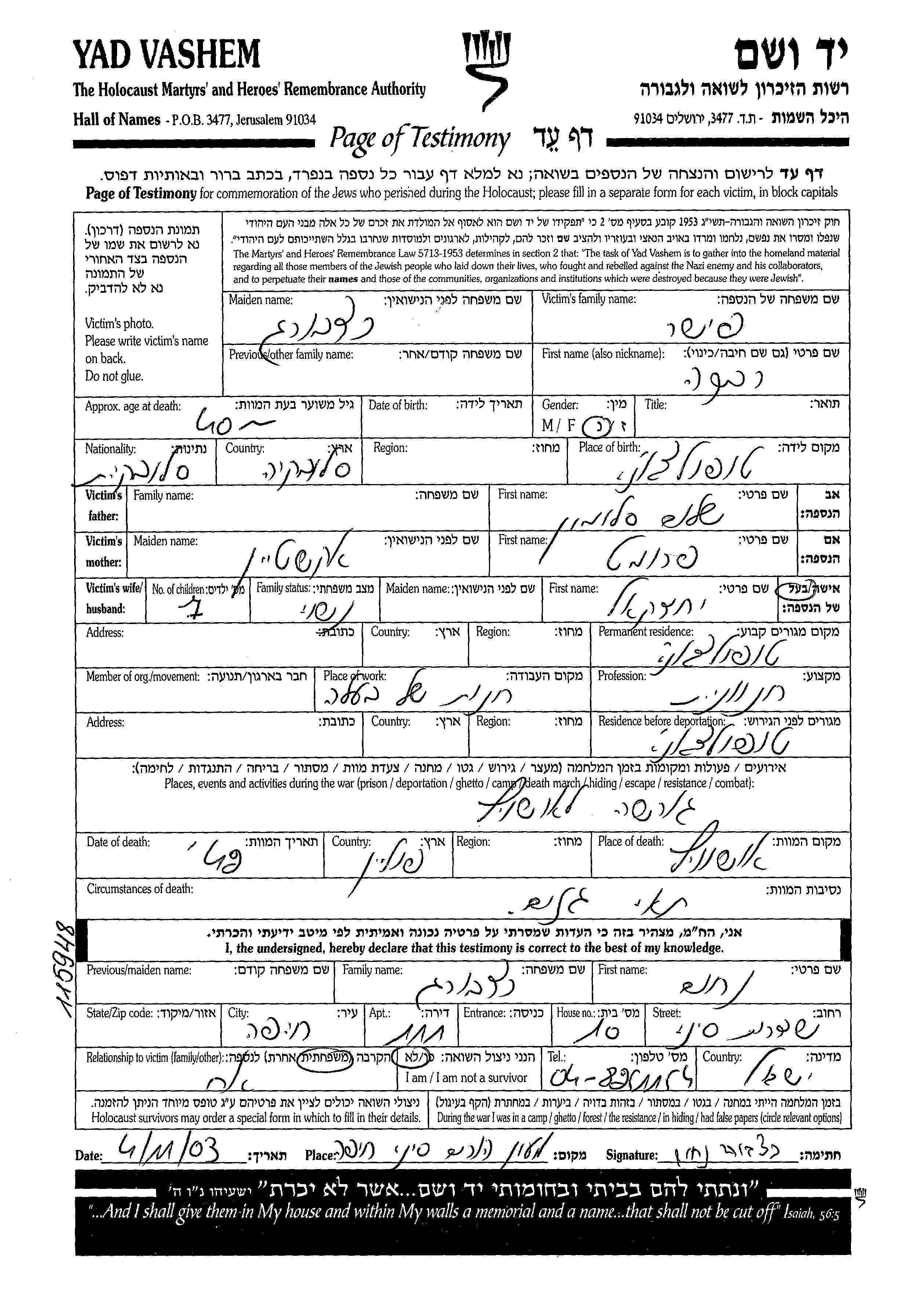 Yad Vashem - Pages of Testimony Names Memorial Collection