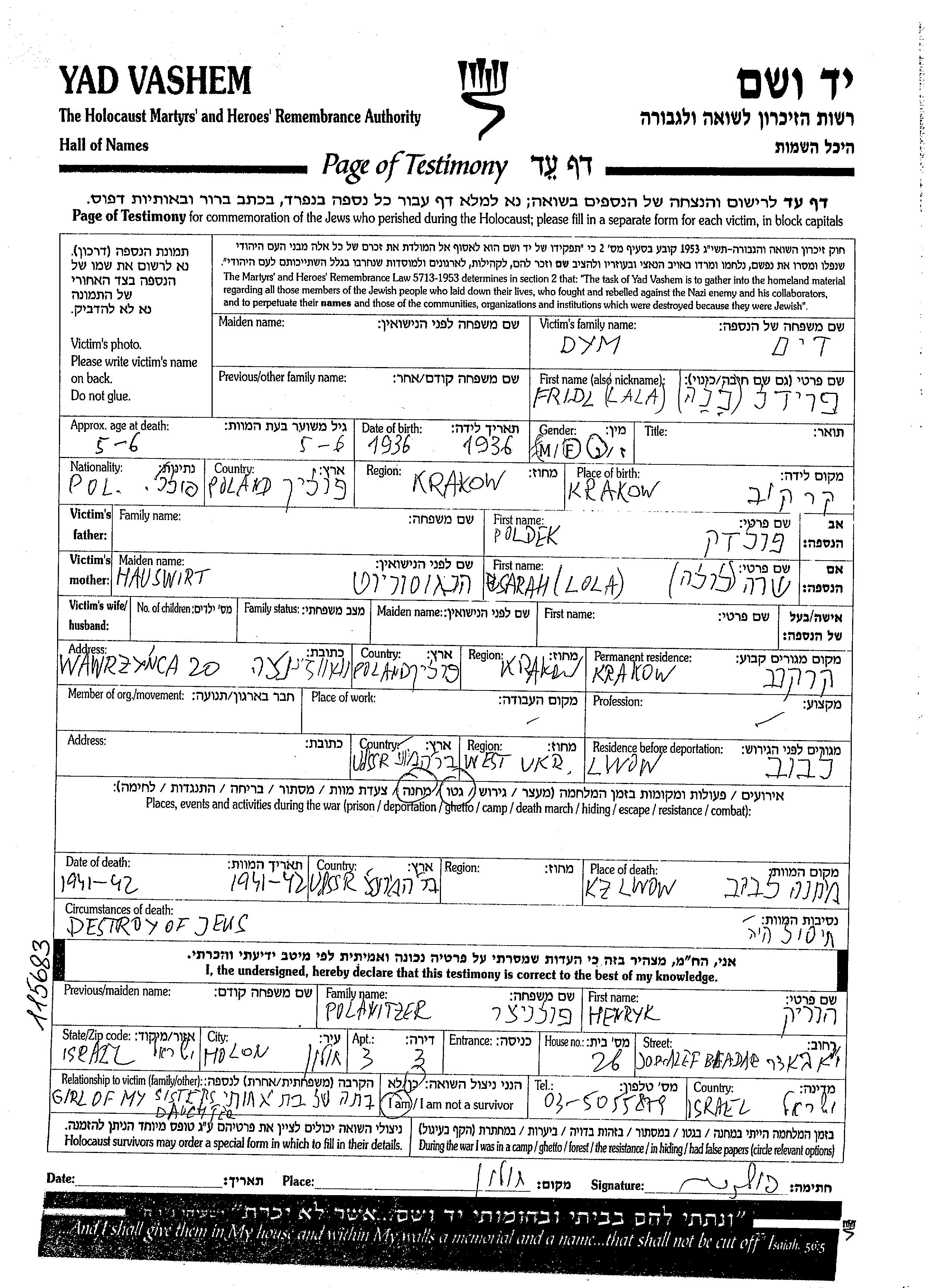 Lala Fridl Dym est née à Krakow, Pologne en 1936, fille de Leopold et de Lola Sara née Hausvirt. Avant la seconde guerre mondiale elle vivait à Krakow, Pologne. Pendant la guerre, elle était à Lwow, Pologne.
