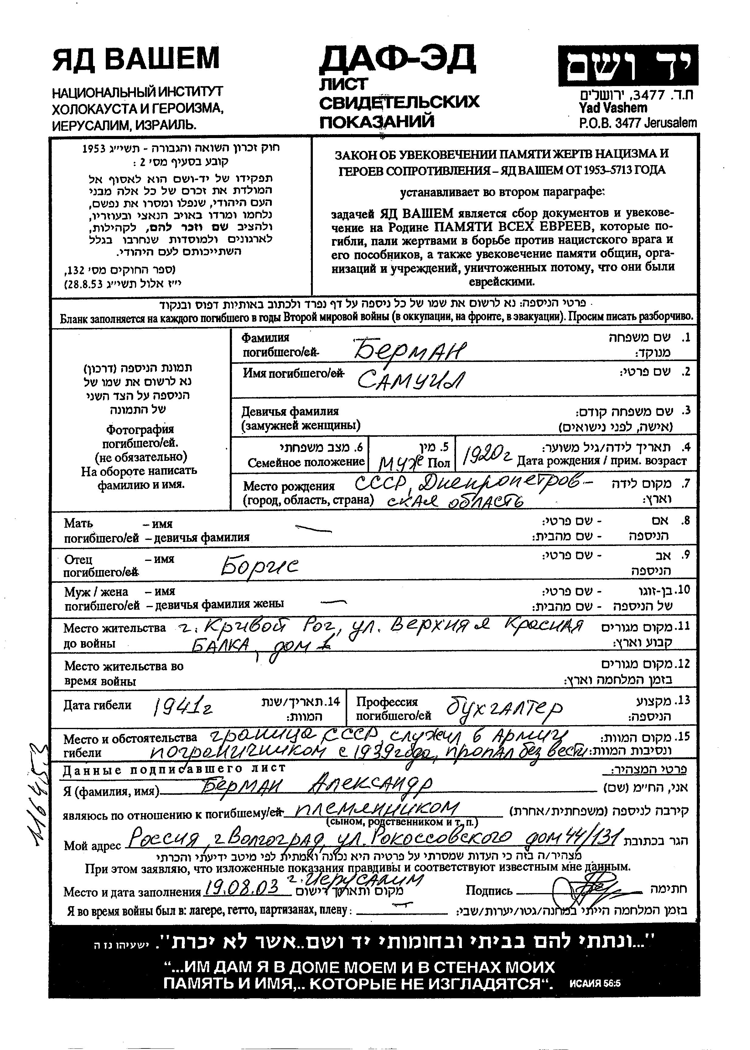 Berman Samuil 1920 Krivoy Rog, Ukraine (URSS) Feuille de témoignage