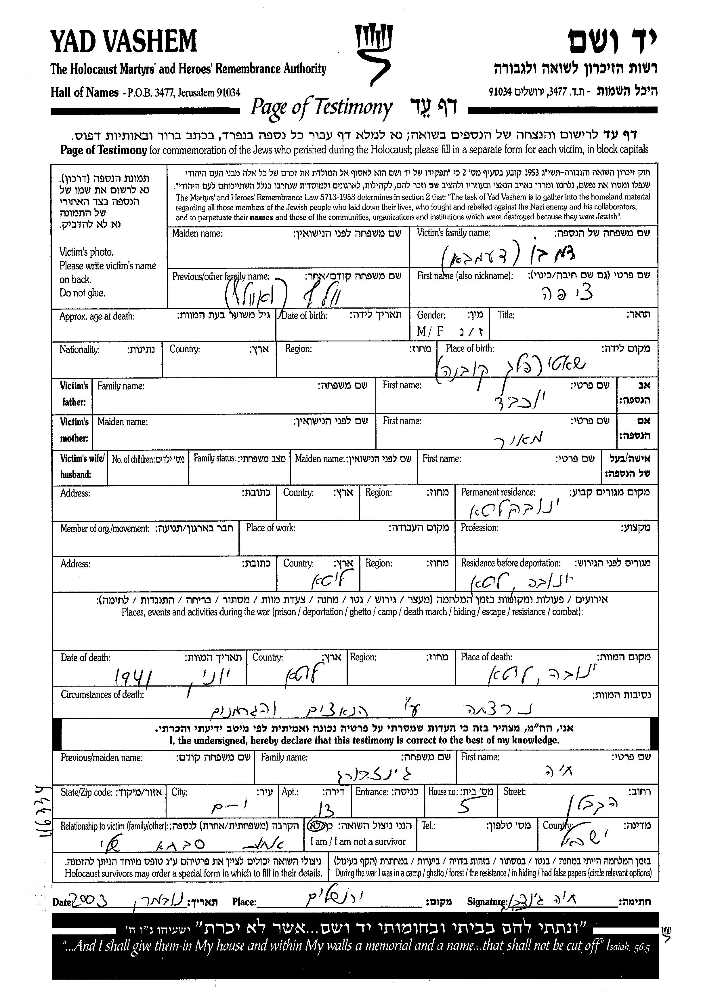 Yad Vashem - Pages of Testimony Names Memorial Collection